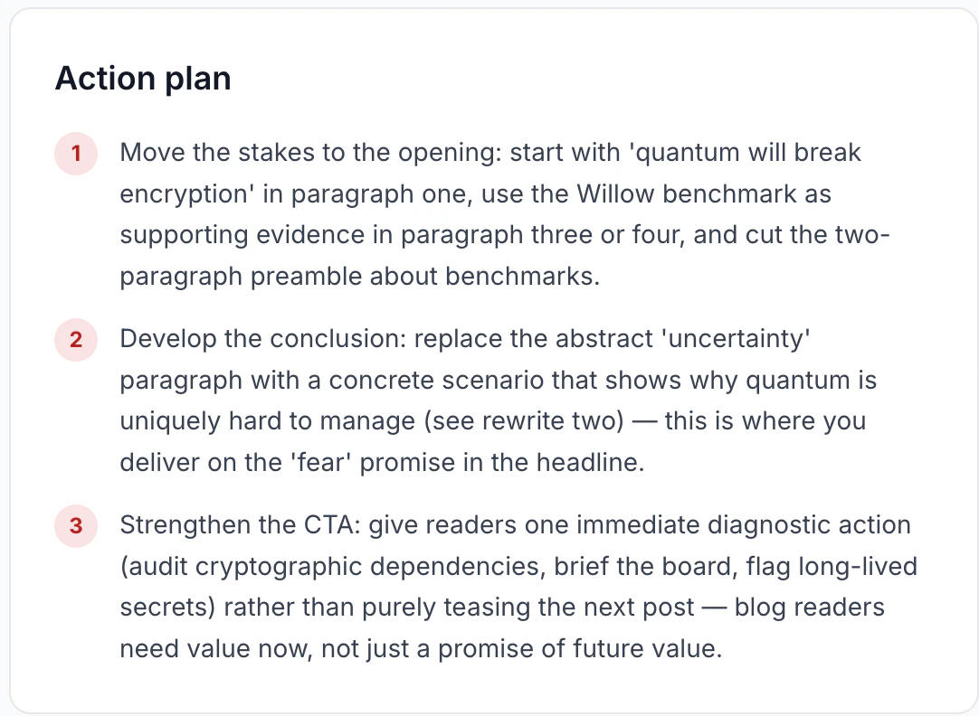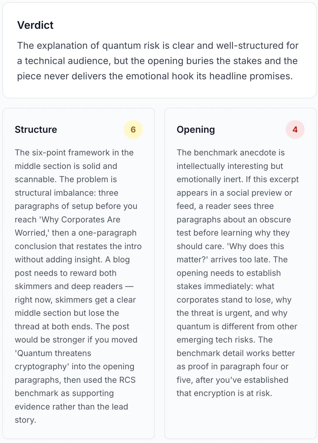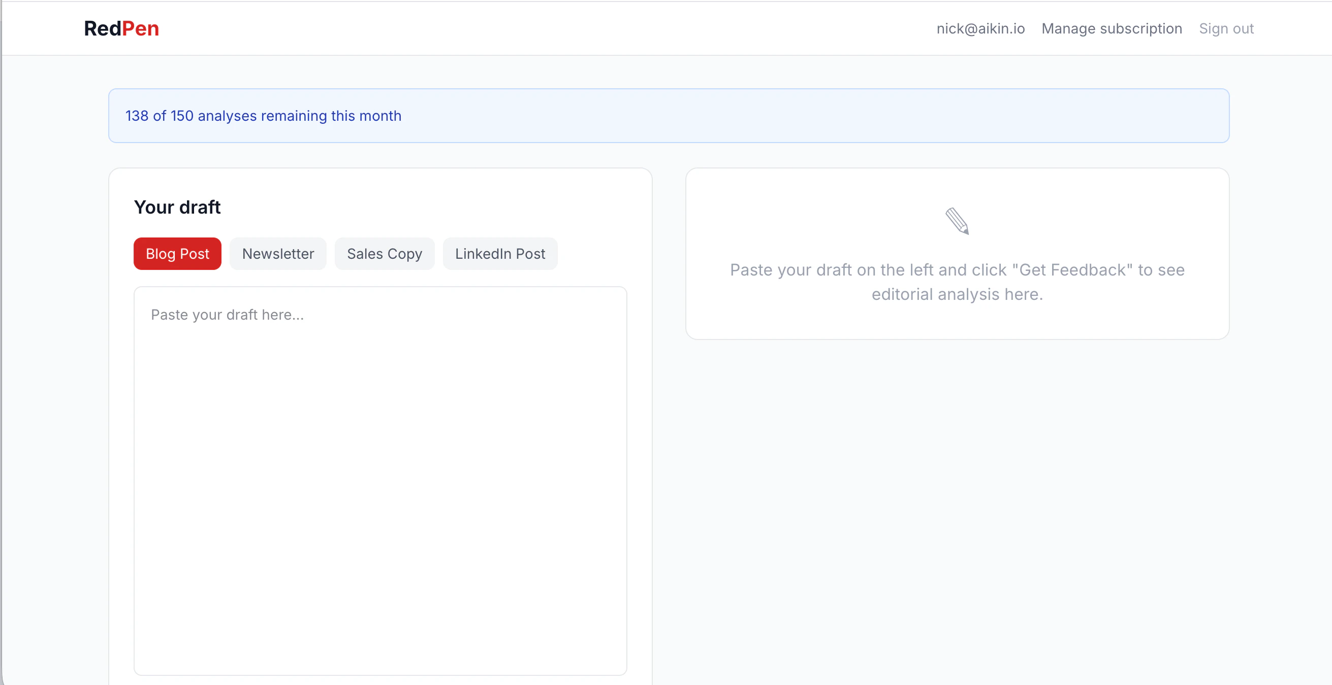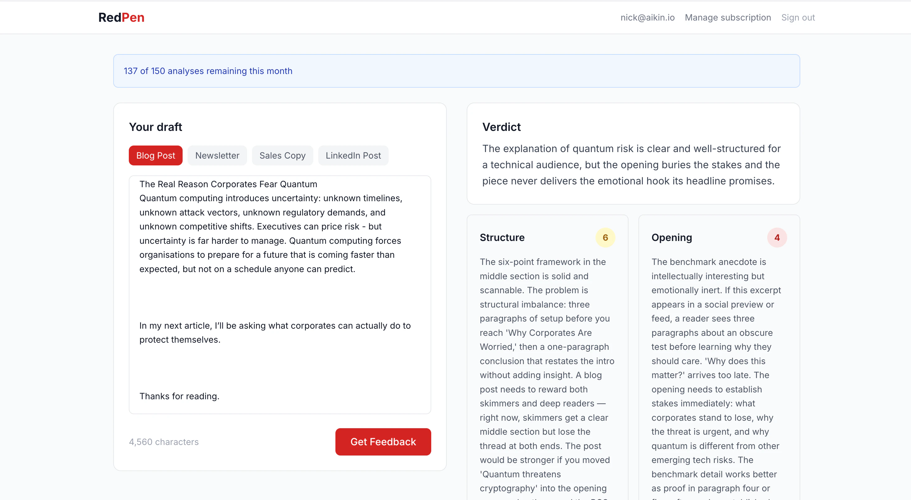 RedPen gives you editorial feedback on your writing — not grammar fixes, but real critique on structure, argument, clarity, and tone. With specific rewrites. For business writers who want their work to land, not just to read cleanly.