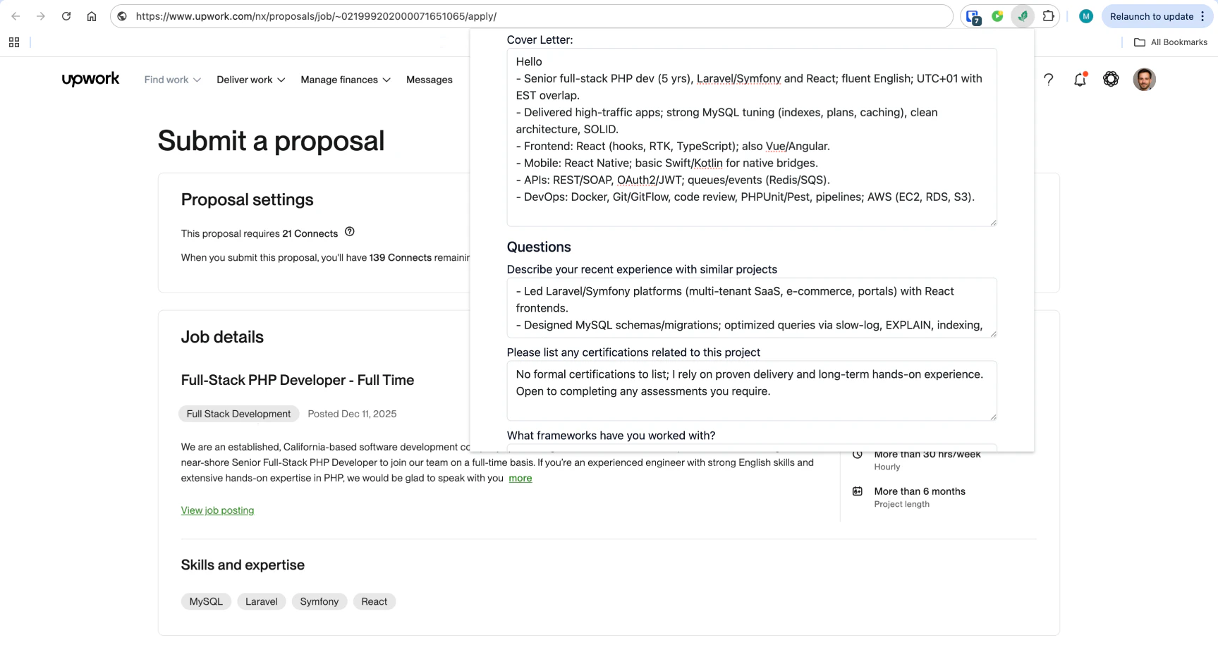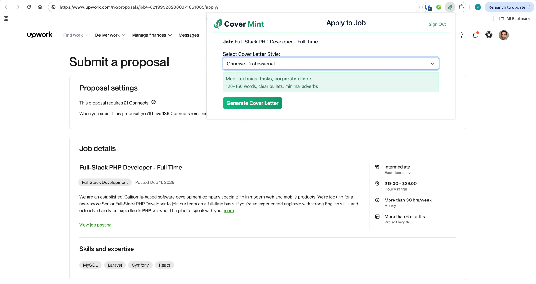 Every Upwork job is different — your cover letter should be too. CoverMint turns job requirements and your profile into a concise, client-focused draft shaped around what matters in that specific project. It aligns your experience with the client’s needs, giving you structured positioning from the start. No overthinking. No scattered messaging. Just a clear draft you can refine and send with confidence.