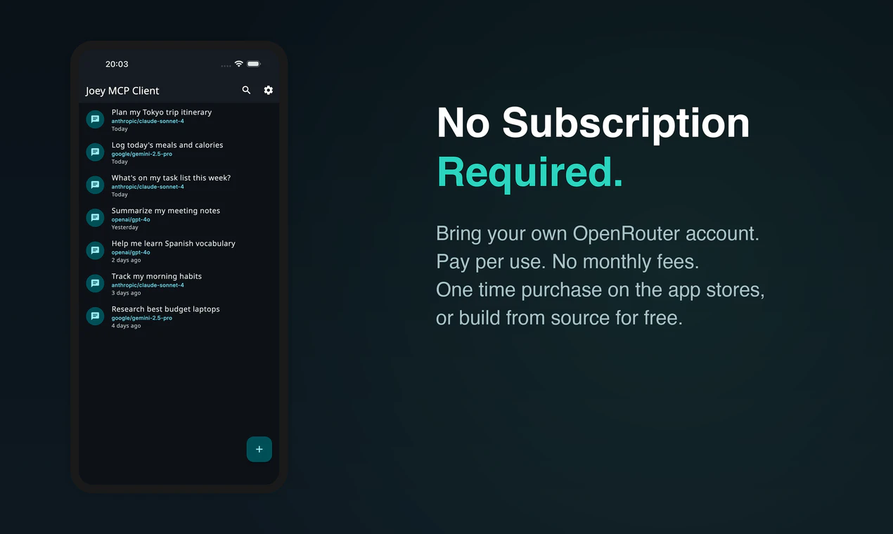 Joey is a chat app that lets you use hundreds of AI models with remote MCP servers. From your phone. Pick any model on OpenRouter, connect your MCP servers, and let the AI use real tools to get things done. Full MCP protocol support: tool calling, sampling, elicitation, OAuth, and session resumption. Most MCP clients today are desktop only. Joey runs natively on iOS, Android, and macOS. Built with Flutter. Source available on GitHub, or grab it from the App Store / Google Play.