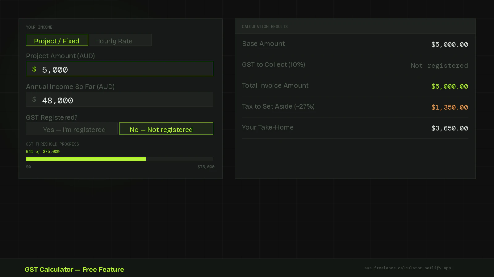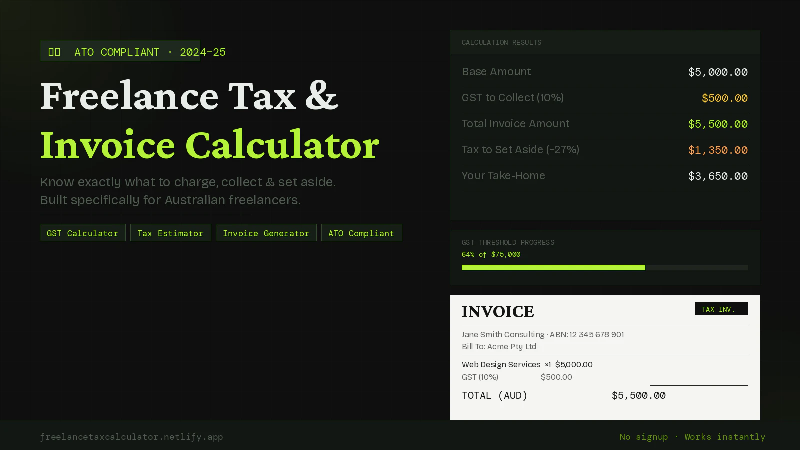 Australian freelancers waste hours Googling GST rules, tax rates and invoice formats every year. I built a simple tool that solves this instantly. FREE features: → GST Calculator — instantly calculates 10% GST → Tax Estimator — know exactly how much to set aside → $75,000 Threshold Tracker — get warned before you cross it FULL version includes: → ATO-compliant Invoice Generator → Print or save as PDF No signup. No app. Works instantly in your browser. Built for traders and freelancers.