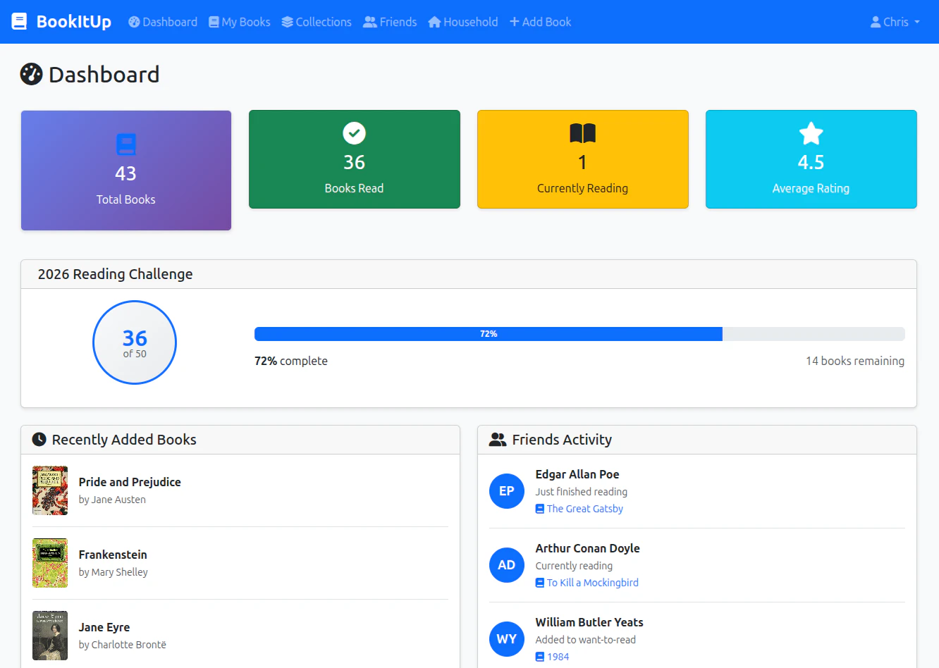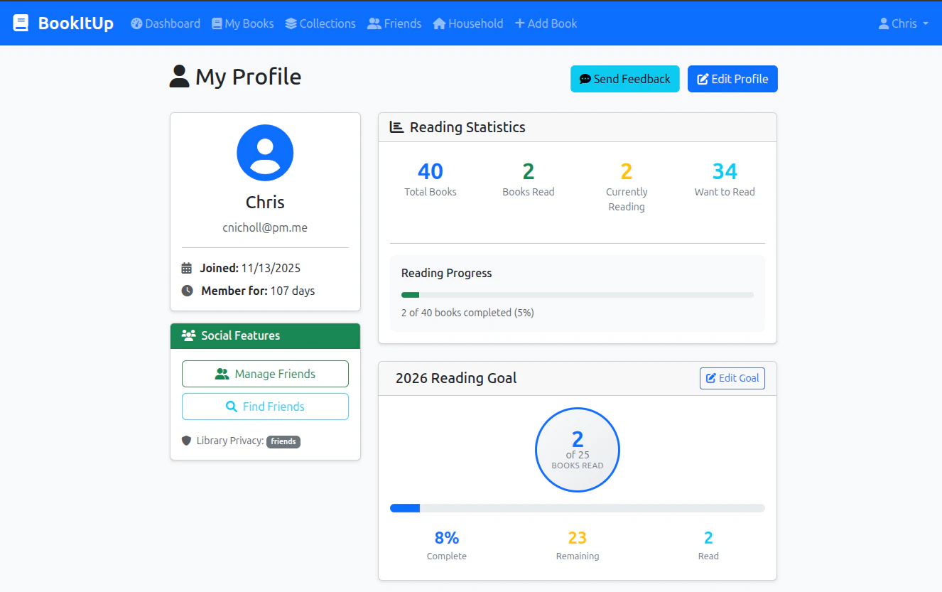 BookItUp is a clean, private Personal Library Manager — no ads, no tracking, not owned by Amazon. Scan any book barcode to instantly add it to your library, track reading status, set goals, write reviews, and share your shelf with friends. Add household members for a fully shared family library. Verified tracking-free by Blacklight. Free forever for up to 100 books — no credit card, ever.