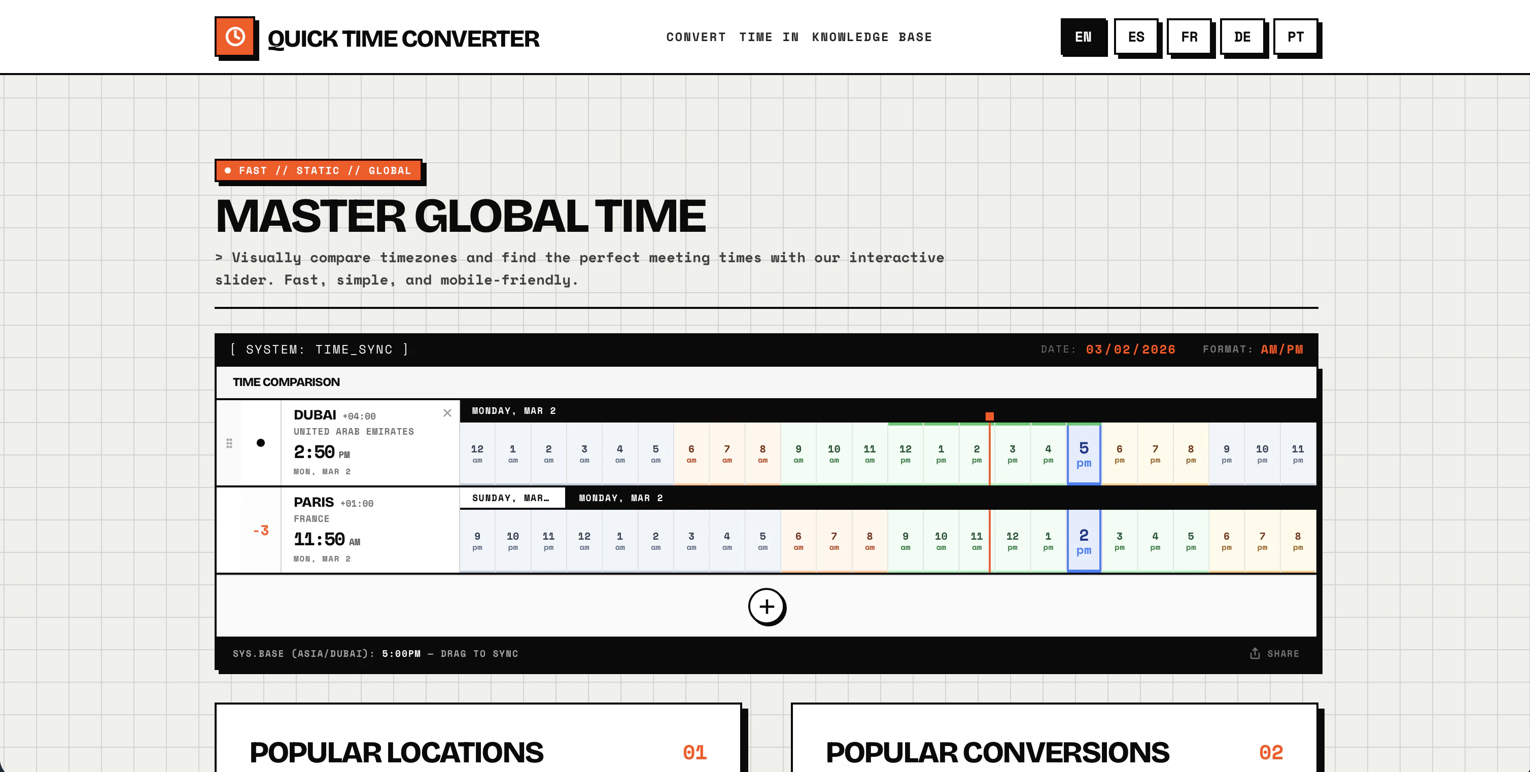Visually compare timezones and find the perfect meeting times with our interactive slider. Fast and simple.