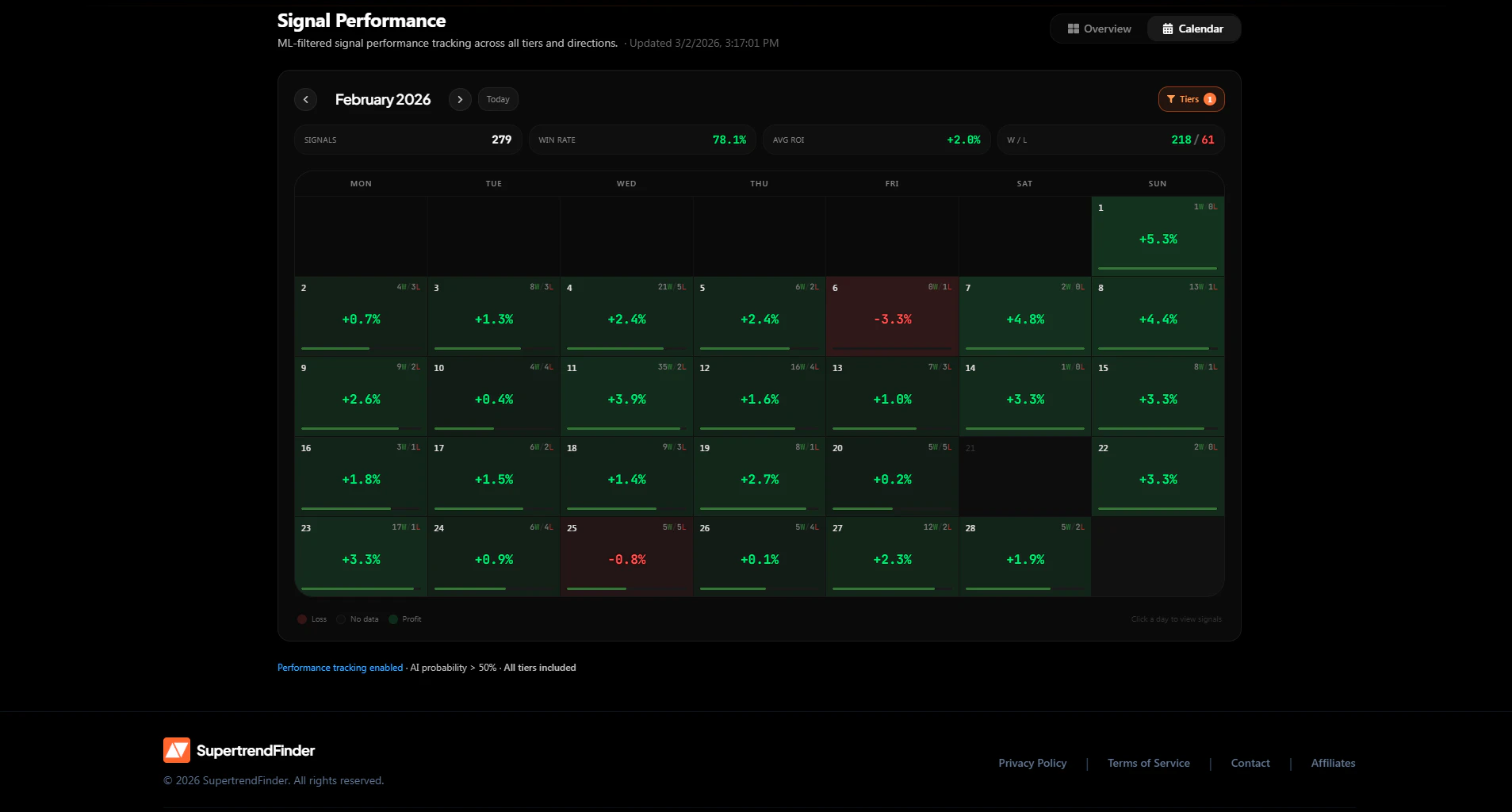 SupertrendFinder scans 1,000+ stocks and crypto assets using advanced models to deliver trading signals with exact entry, stop-loss, and take-profit levels. Every signal is tracked publicly from open to close, no cherry-picking, no hidden losses. Four quality tiers (up to 87% win rate on Elite signals) let you choose your confidence level. Get real-time alerts, built-in risk management, and full performance transparency. Free tier available, no card required.
