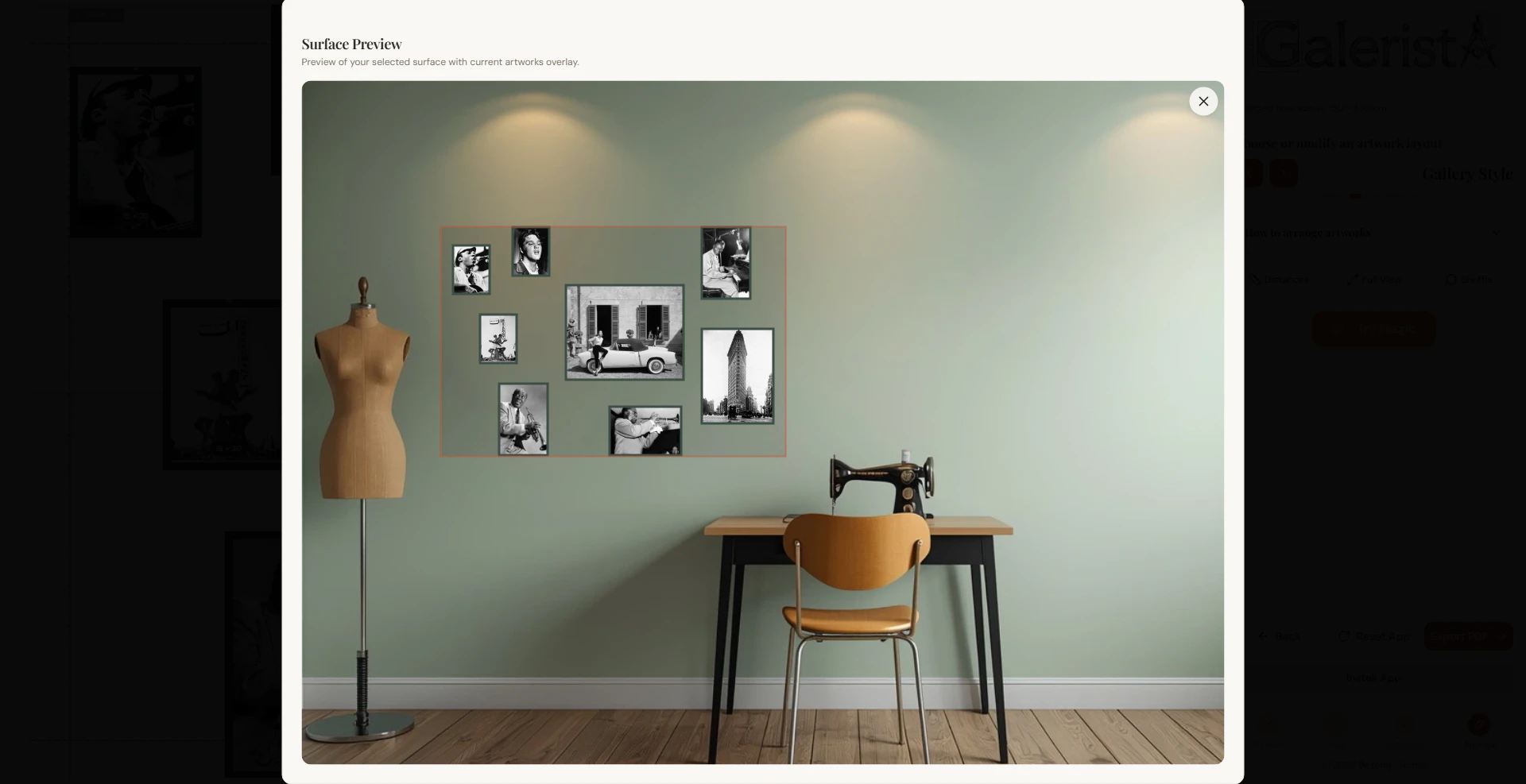 Professional tool designed for homeowners, interior designers, and art enthusiasts who want pro-design, beautiful arrangements. Auto-arrange, select a layout or fine-tune manually. Preview and check dimensions. Generate technical drawings with exact measurements and mounting instructions for perfect gallery walls. Export a detailed document with your gallery wall plan. The technical drawing includes precise coordinates, measurements and a complete mounting guide for hassle-free installation.
