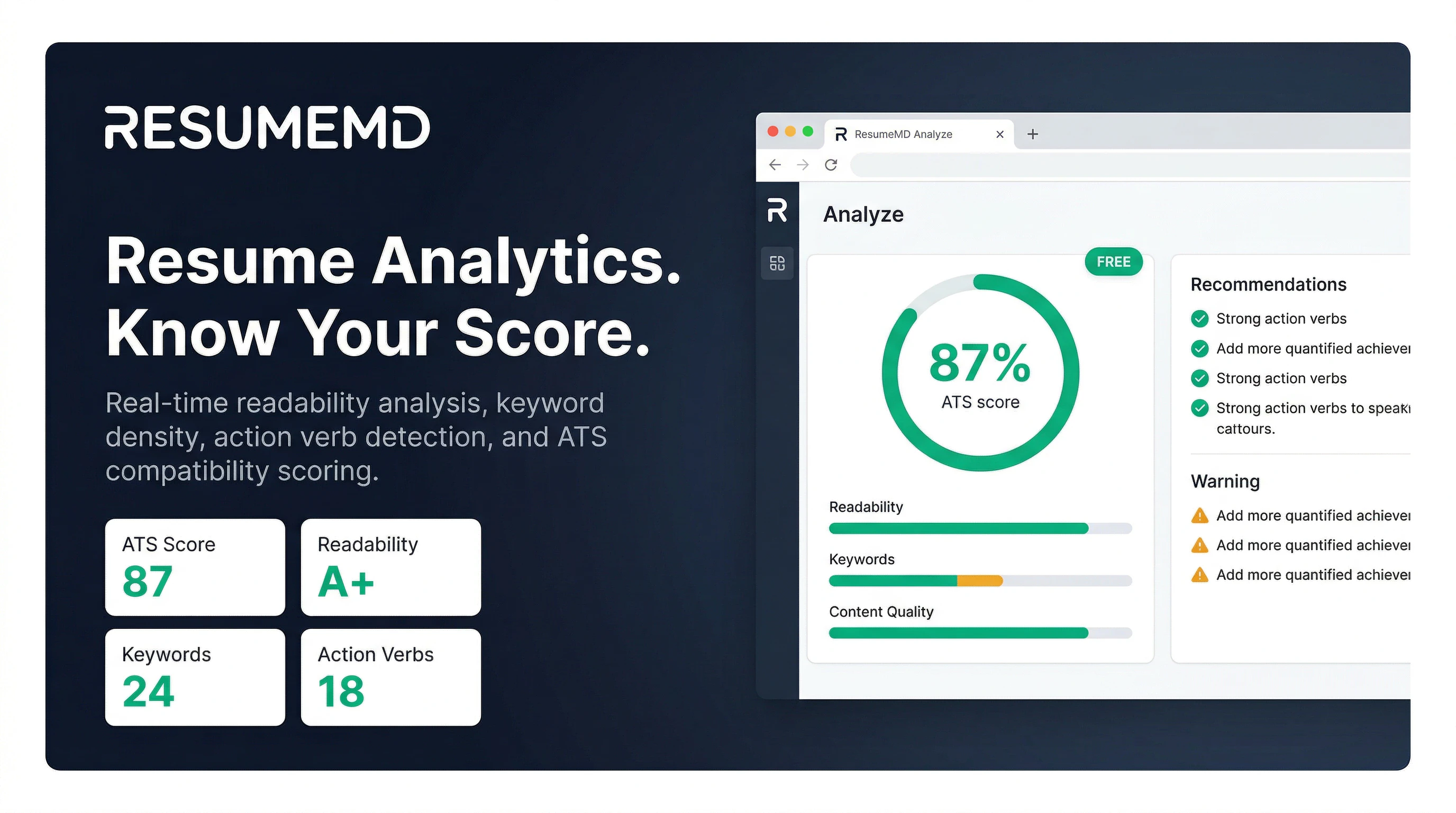 ResumeMD is a free markdown resume builder for the AI era. Paste your ChatGPT, Claude, or Gemini resume text, pick from 32 ATS-optimized templates, and export a polished PDF in 60 seconds. No signup. No watermark. No credit card. Your data stays in your browser. Key features: - Split-pane editor with live preview - Resume analytics (readability, keywords, ATS score) - Custom colors, fonts, margins - PDF export that passes ATS systems Free forever. Pro for cloud sync, AI job tailoring.