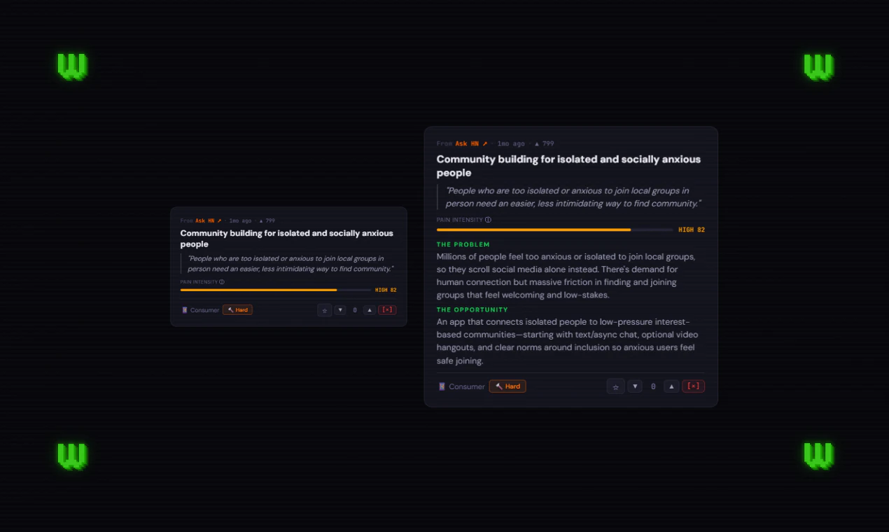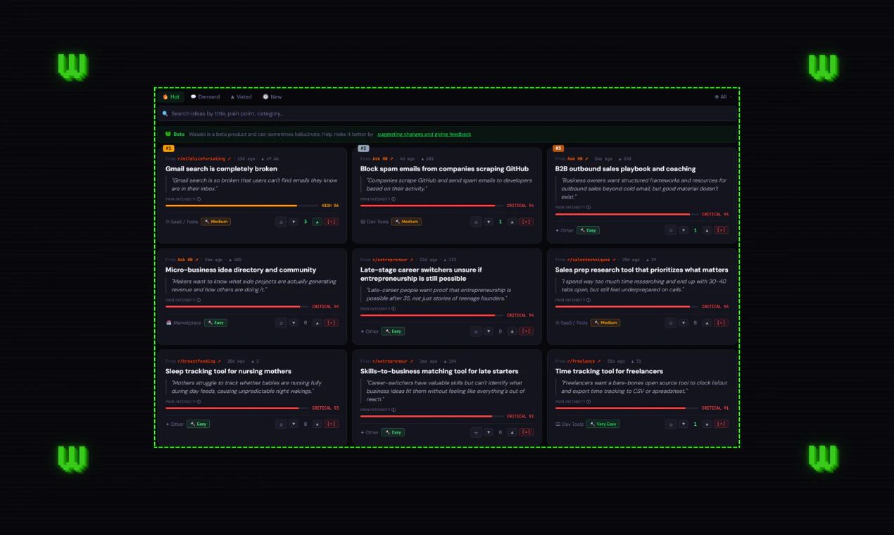 Wasabi scrapes Reddit, HN, and other platforms to surface validated business ideas - ranked by pain intensity, demand, and build difficulty. Every idea is backed by real user sentiment, not guesswork. Browse hot pain points, upvote what resonates, save your favorites, and filter by category. You can also submit your own ideas to the community. Ideas are automatically scrapped, AI filtered, but curated by humans - so you only see ideas worth building