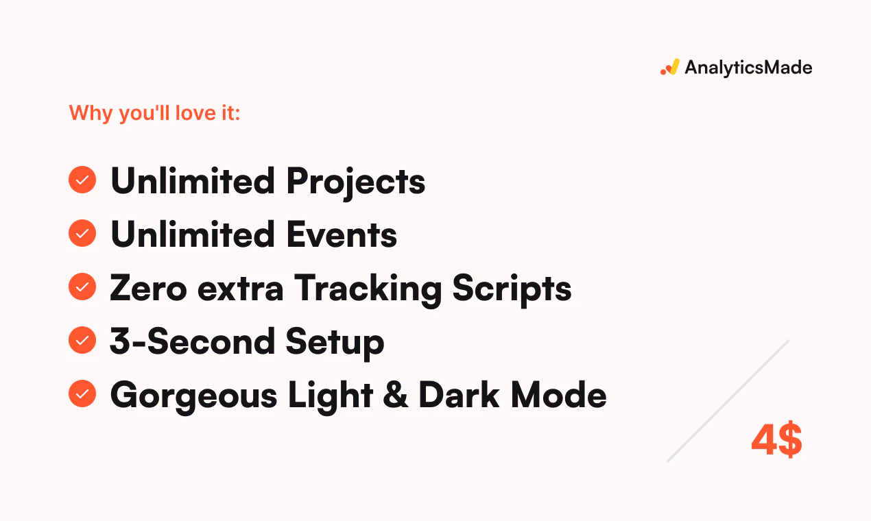GA4 is powerful but a nightmare to use. AnalyticsMade is a beautiful, simplified dashboard built on top of your existing GA4 data. No need to install new scripts, migrate data, or pay high traffic-based fees like other tools. Standout features: π 3-second setup (Google Sign-in) βΎοΈ Unlimited events & projects π Zero data stored on our servers β¨ Gorgeous Light & Dark UI Stop fighting GA4. Get essential daily metrics instantly for just $4/mo or a $50 lifetime deal.