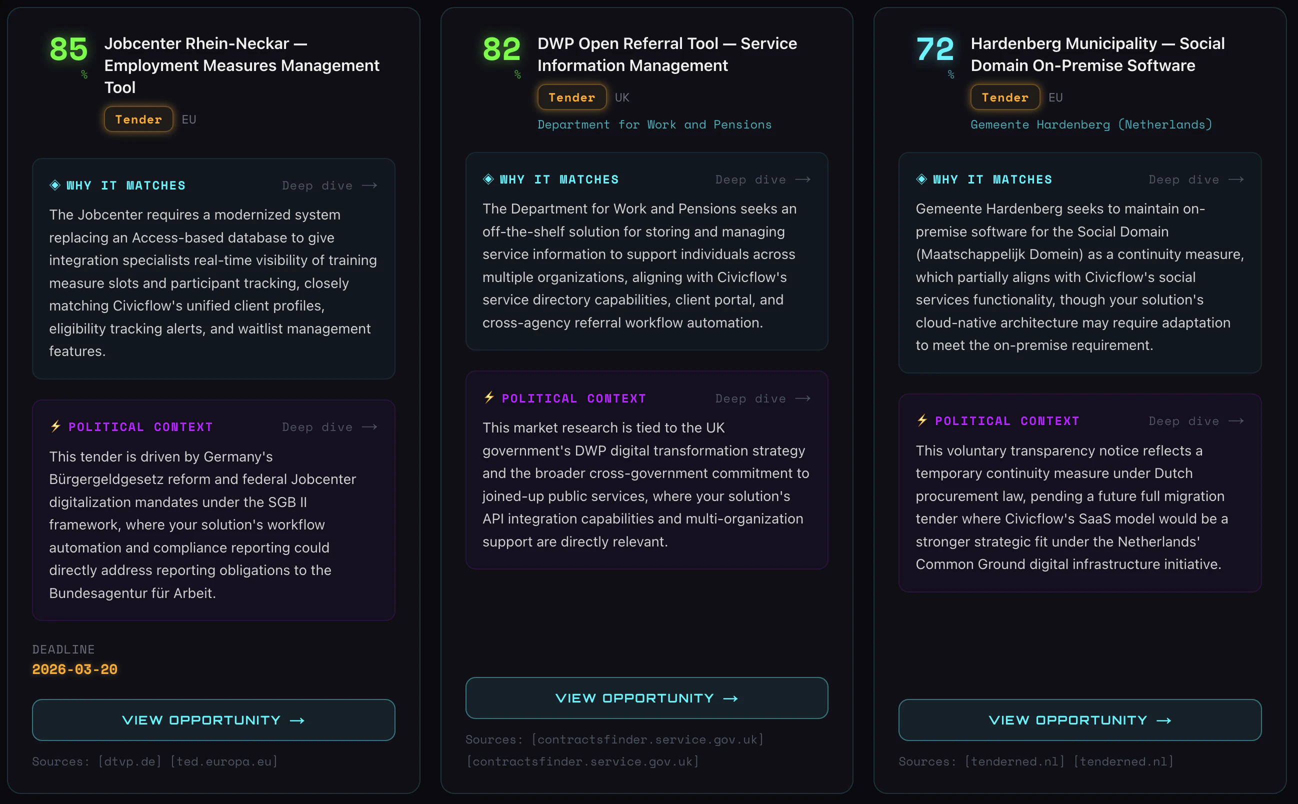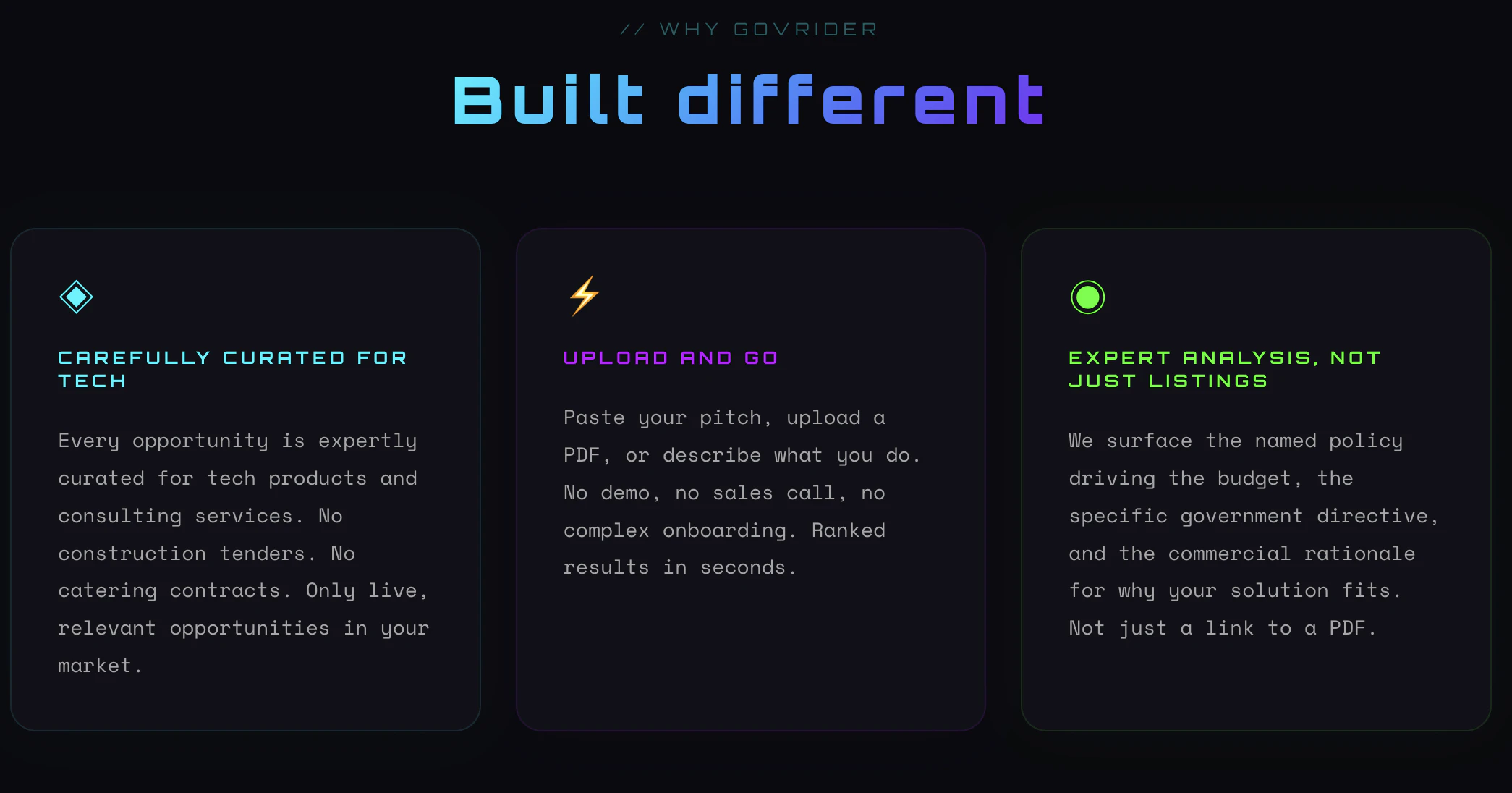 Governments spend trillions in procuring and funding technology, but accessing that capital is notoriously complex. GovRider is the first tech-to-government platform connecting tech companies and consultants with curated, high-value tenders, RFPs, grants, and more across 50+ countries, pairing them with the expert political and commercial analysis needed to win.