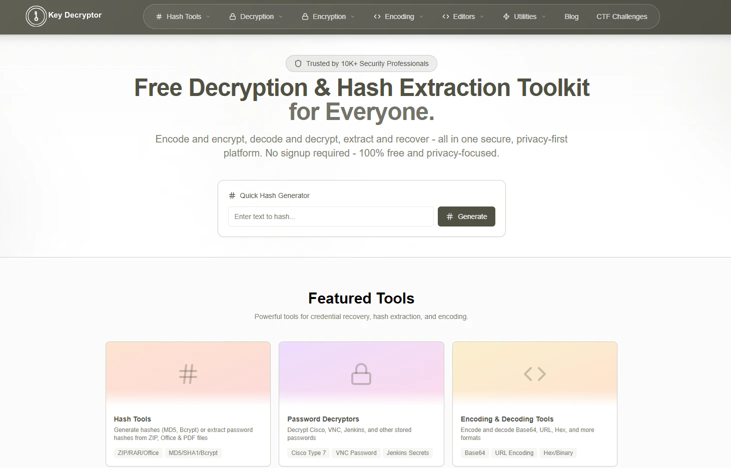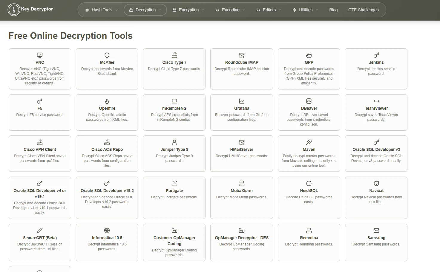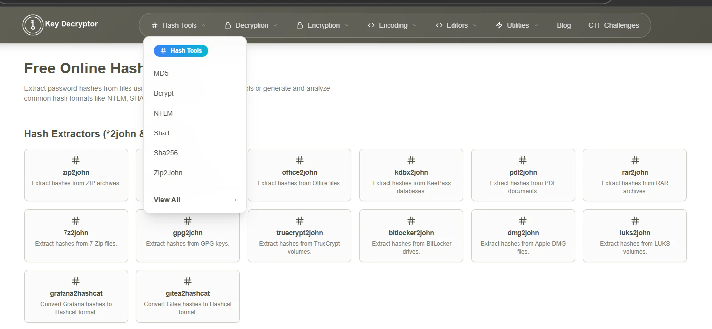 KeyDecryptor is an online toolkit built for developers and security professionals who need fast decryption and hash analysis tools. Recover stored credentials, extract password hashes, decode secrets, and convert formats directly in your browser. No installation required. Designed for ethical hacking, security testing, and everyday development workflows.