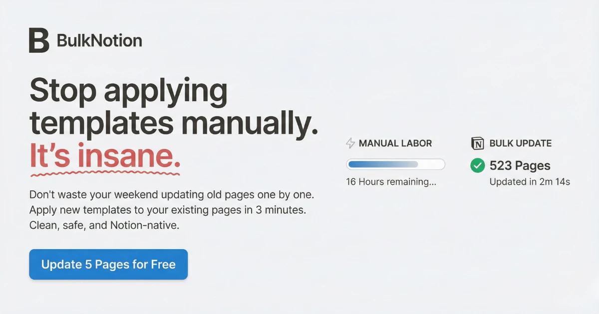 Notion has no way to bulk-apply templates to existing pages. You're stuck opening each page, applying the template, and repeating — 1,000 times. BulkNotion fixes this! Pick a template, filter pages by status or tags, hit Start. Hundreds update in minutes with zero data loss. 1. Bulk template application across entire databases 2. Precision filtering (status, tags, date) 3. 100% Notion-native — no data migration Built by a Notion user who wasted a weekend doing it manually 🚀