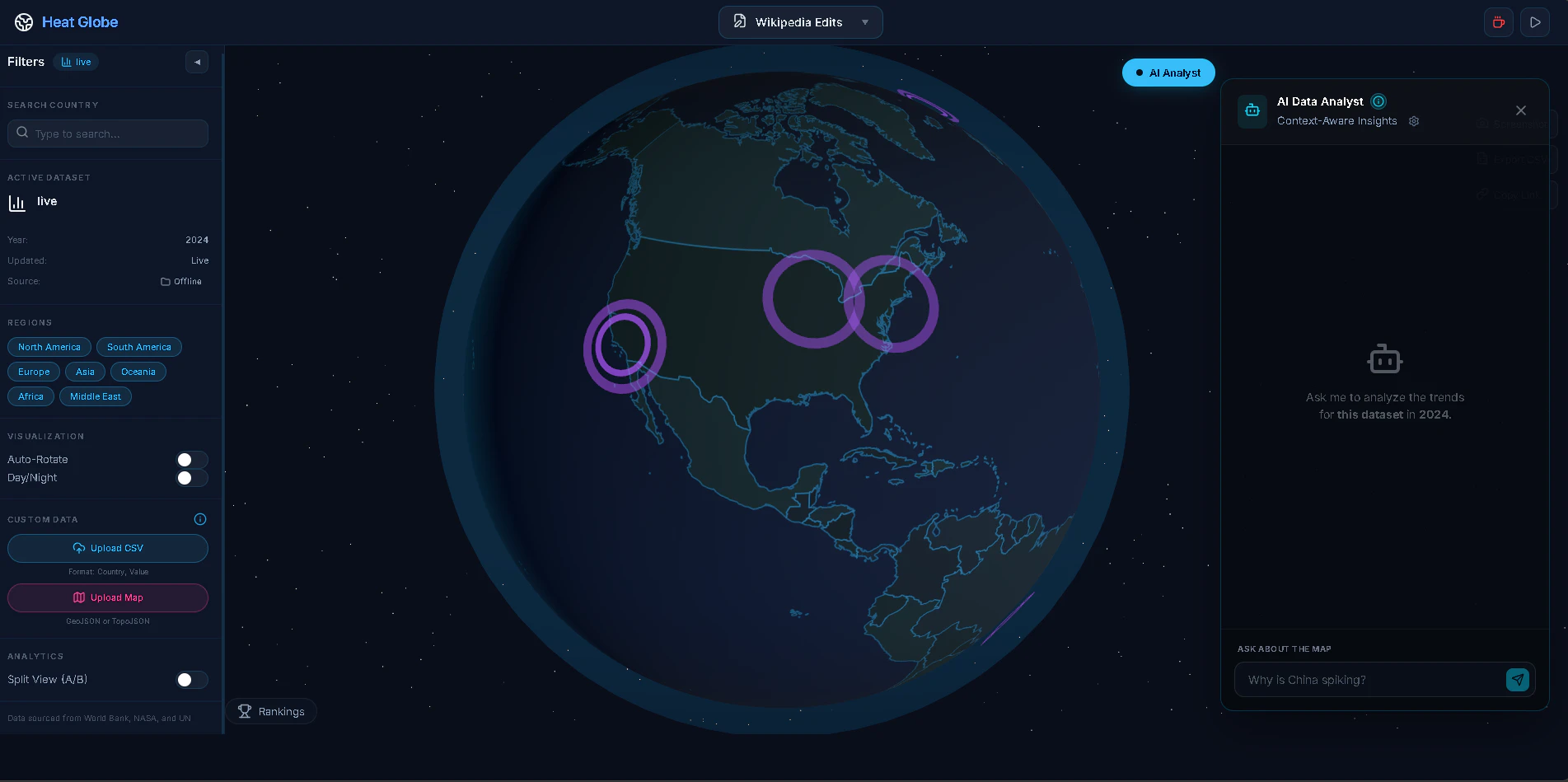 Transform complex datasets into a beautiful, explorable 3D world. Heat Globe maps live events (like ISS tracking) and historical data (like GDP and climate) directly onto a 3D Earth running at 60fps in your browser. Switch seamlessly between heatmaps and population spikes, compare metrics in split-screen mode, and use our built-in AI Analyst to get instant, context-aware insights on the data you're viewing. 100% free with no login required.