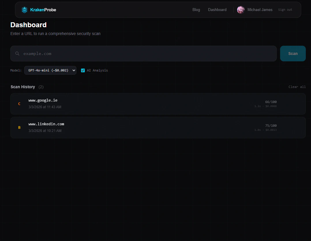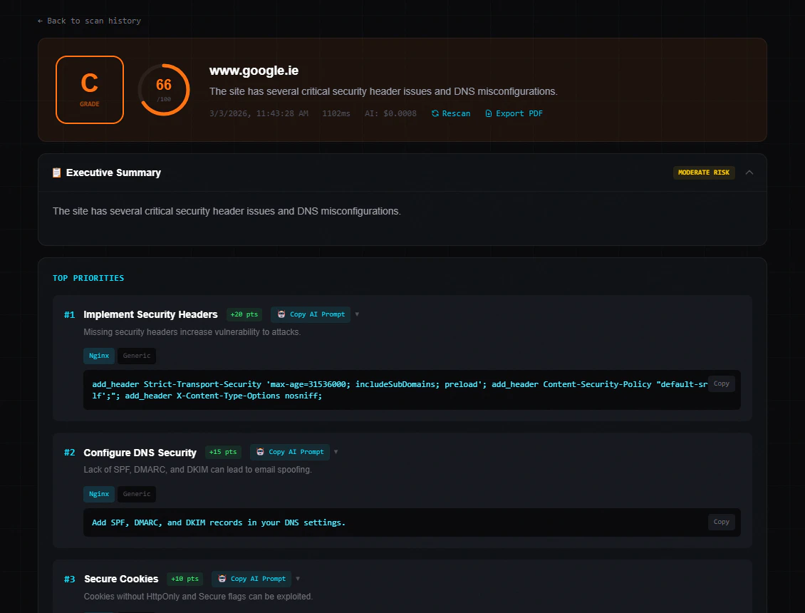 10 security scans run in parallel — TLS, headers, DNS, cookies, CORS, libraries, exposed files, and more. AI grades your site A-F with a score out of 100, then generates copy-paste fixes for your exact platform (Netlify, Vercel, Cloudflare, Nginx, WordPress). No security jargon. No enterprise pricing. Results in ~10 seconds. Built for no-code builders and small businesses who want to know if their site has obvious security holes. Free. Sign in with Google or GitHub.