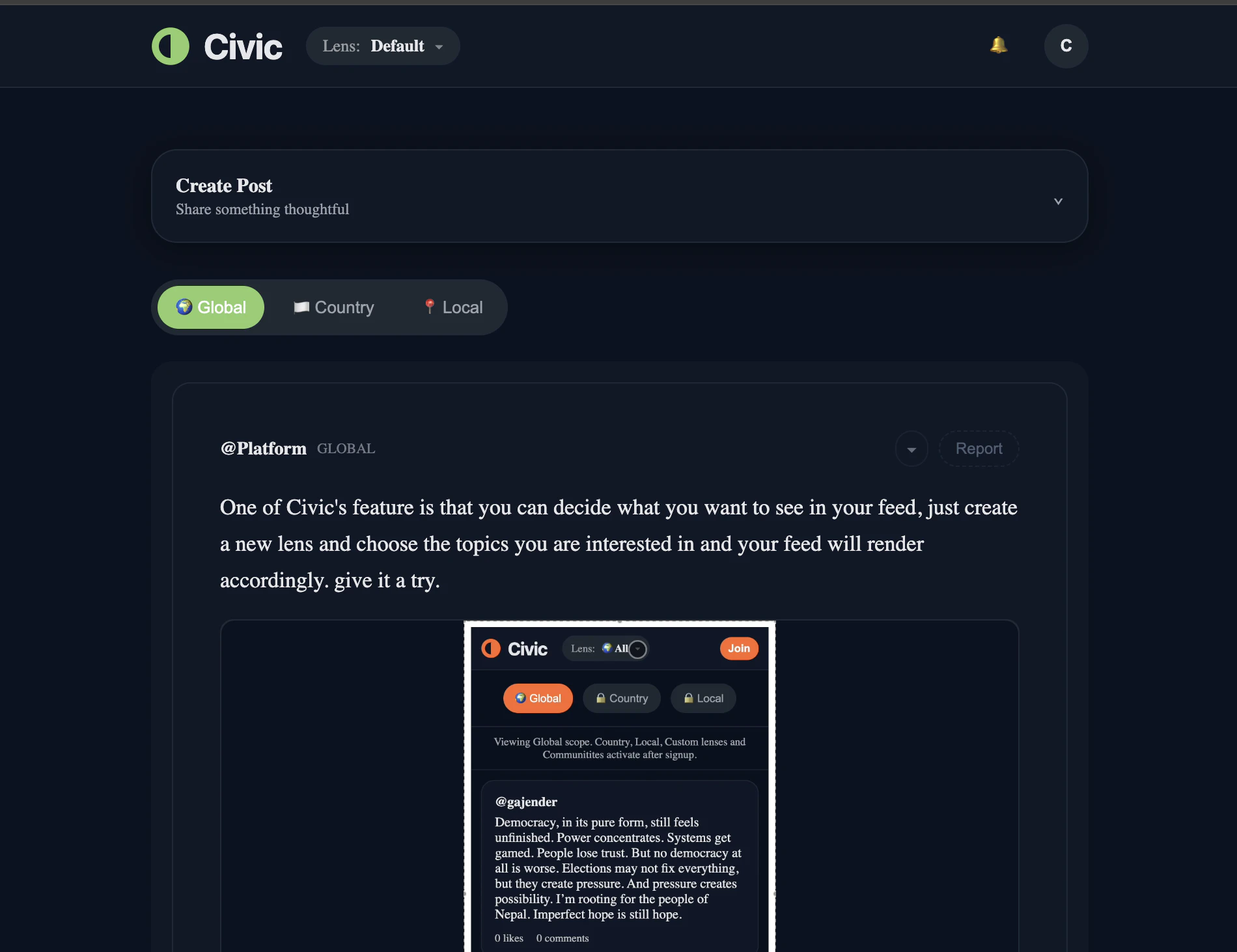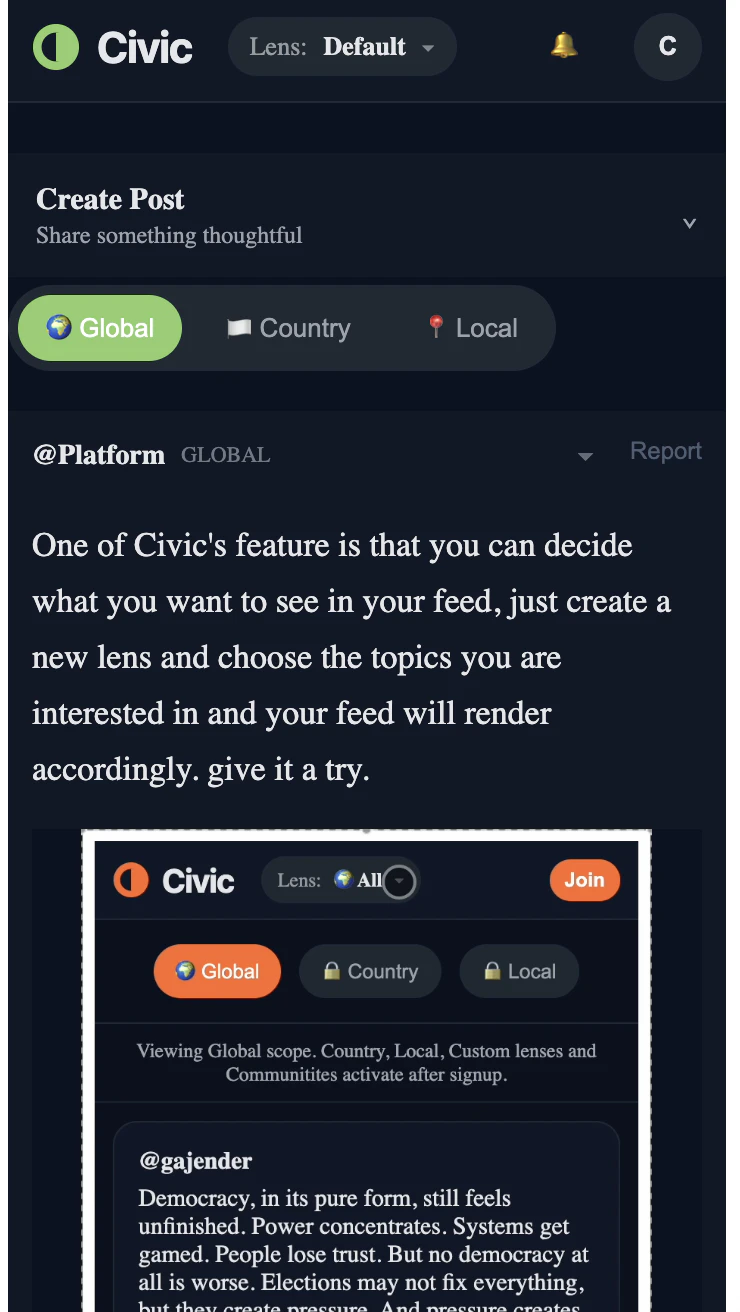 CivicHalls is a social network built on one idea: you should control what you see. Instead of a hidden algorithm shaping your worldview, you can switch lenses instantly depending on your interest, You can have a feed showing only job posts from global/your country/your city. or just memes or just politics or everything u like. Reshape your feed in seconds. Create focused communities. Build meme-on-meme conversations. No opaque ranking. No forced narratives. Just structured digital freedom.