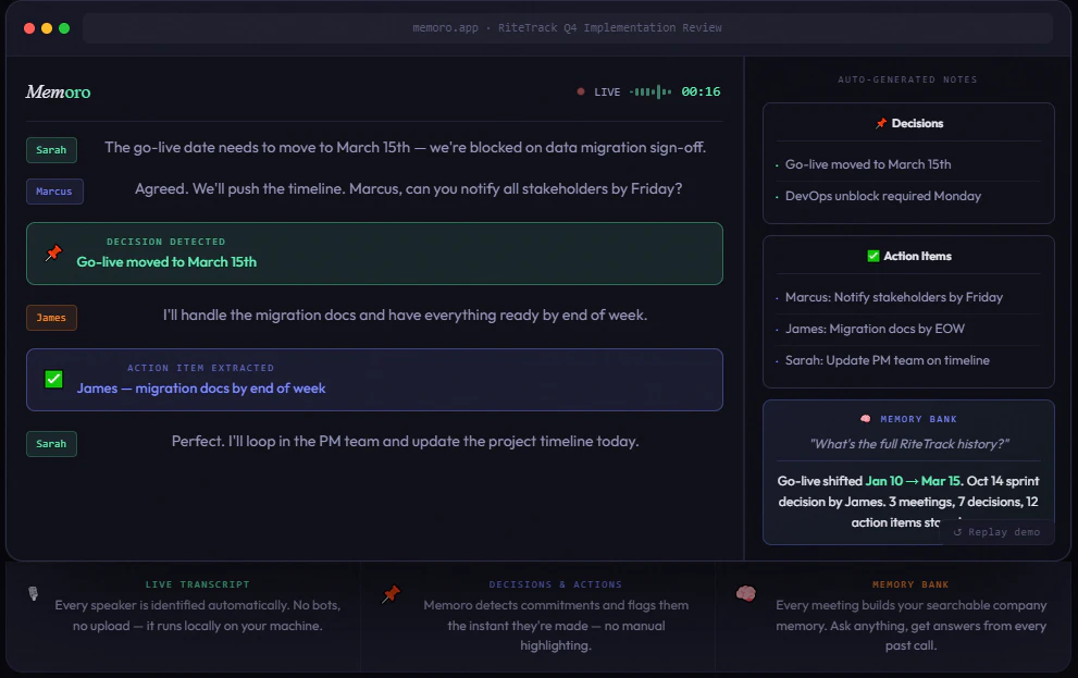 Stop taking notes on calls. Memoro automatically transcribes your meetings, generates smart summaries, and extracts action items so you can focus 100% on the conversation. Never lose a decision or action item, and fain institutional memory. Designed for founders, sales teams, and consultants who want clean, searchable documentation without the manual work.