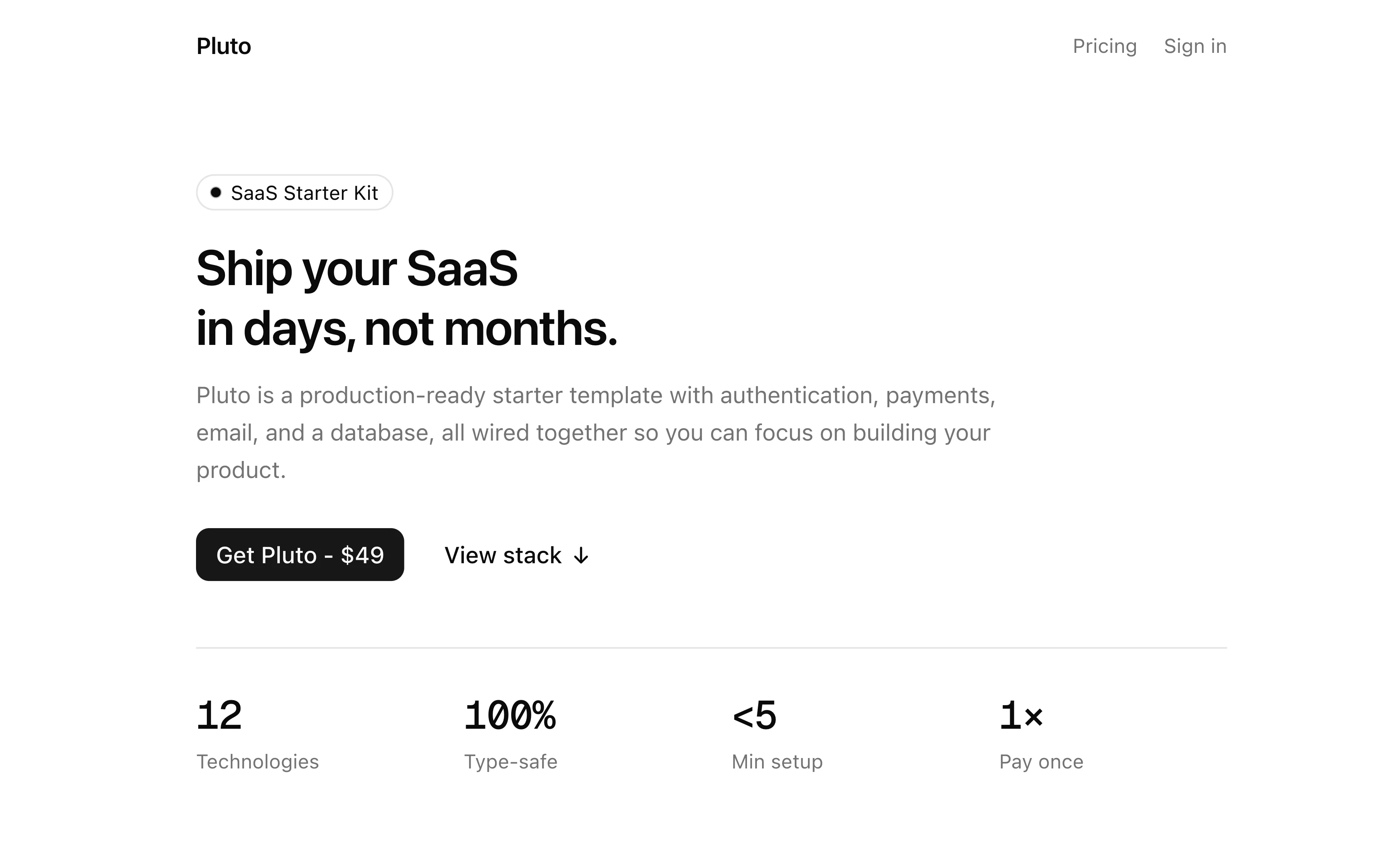 Pluto is a production-ready SaaS starter template with authentication, payments, and database integration so you can focus on building your product.