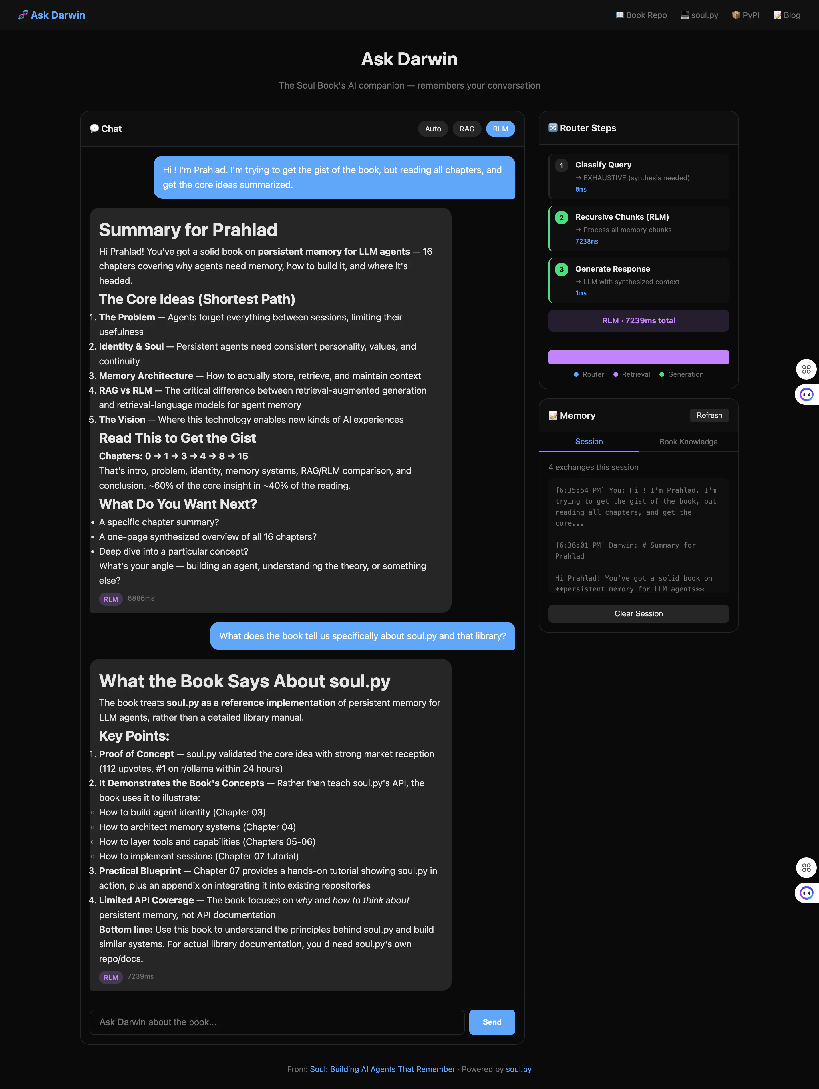 Every AI assistant has amnesia — close the terminal and context is gone forever. soul.py fixes this with two markdown files: SOUL.md (identity) and MEMORY.md (memory). Git-versioned, human-editable, zero infrastructure. Works with Claude, GPT, or free local models via Ollama. pip install soul-agent → soul init → soul chat. v2.0 includes a RAG+RLM hybrid router. soul-stack (Docker) adds it as a persistent service for n8n. Enterprise teams can use SoulMate API for managed cloud memory!