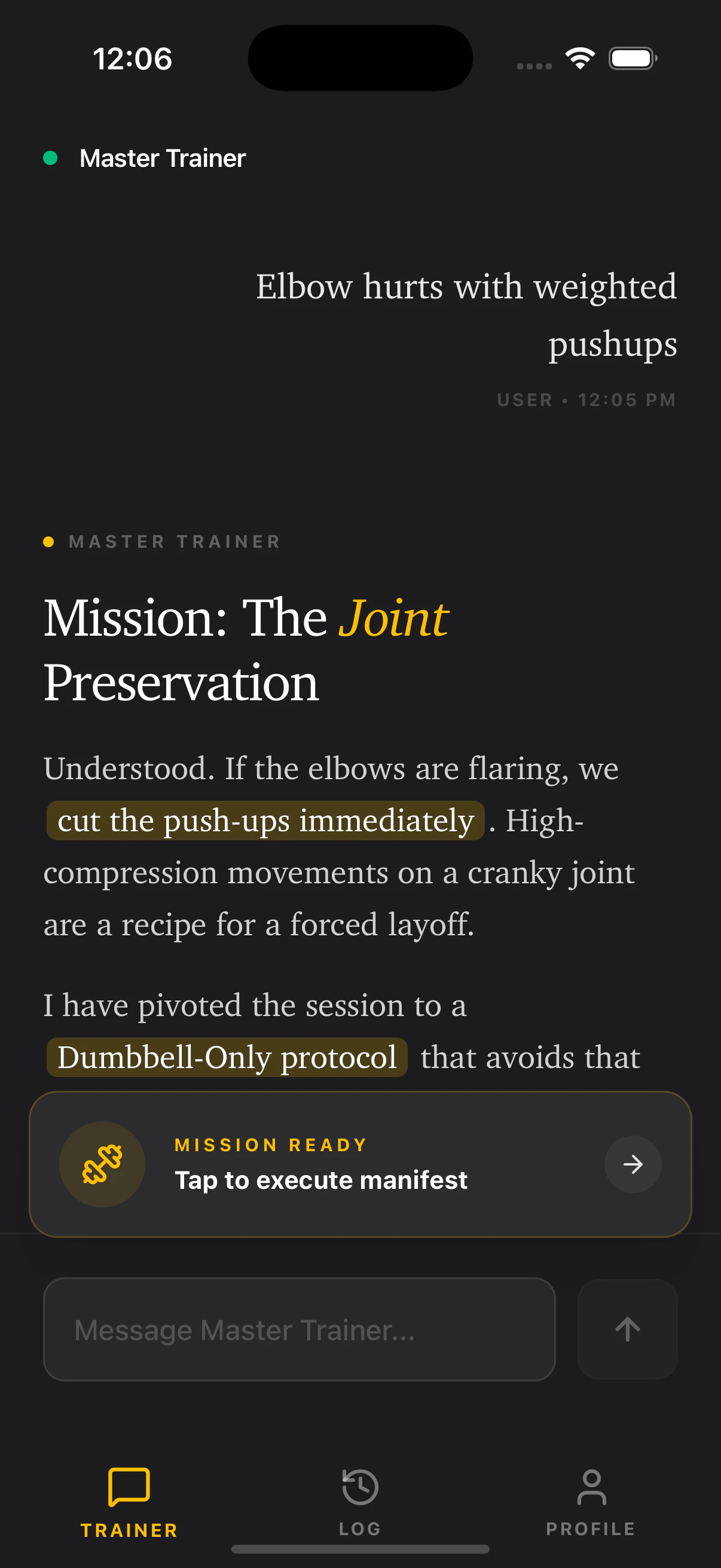 Master Trainer replaces rigid workout templates with a context-aware AI routing engine. Instead of a chatbot, it is a system that understands your biomechanics and instantly adapts your daily session based on equipment, sleep, or sudden aches. Standout features include External Load Auditing to credit real-world labor, a gimmick-free tracking UI, and built-in EMOM and AMRAP timers. It is not just a workout logger; it is a chief of staff for your physical capacity.