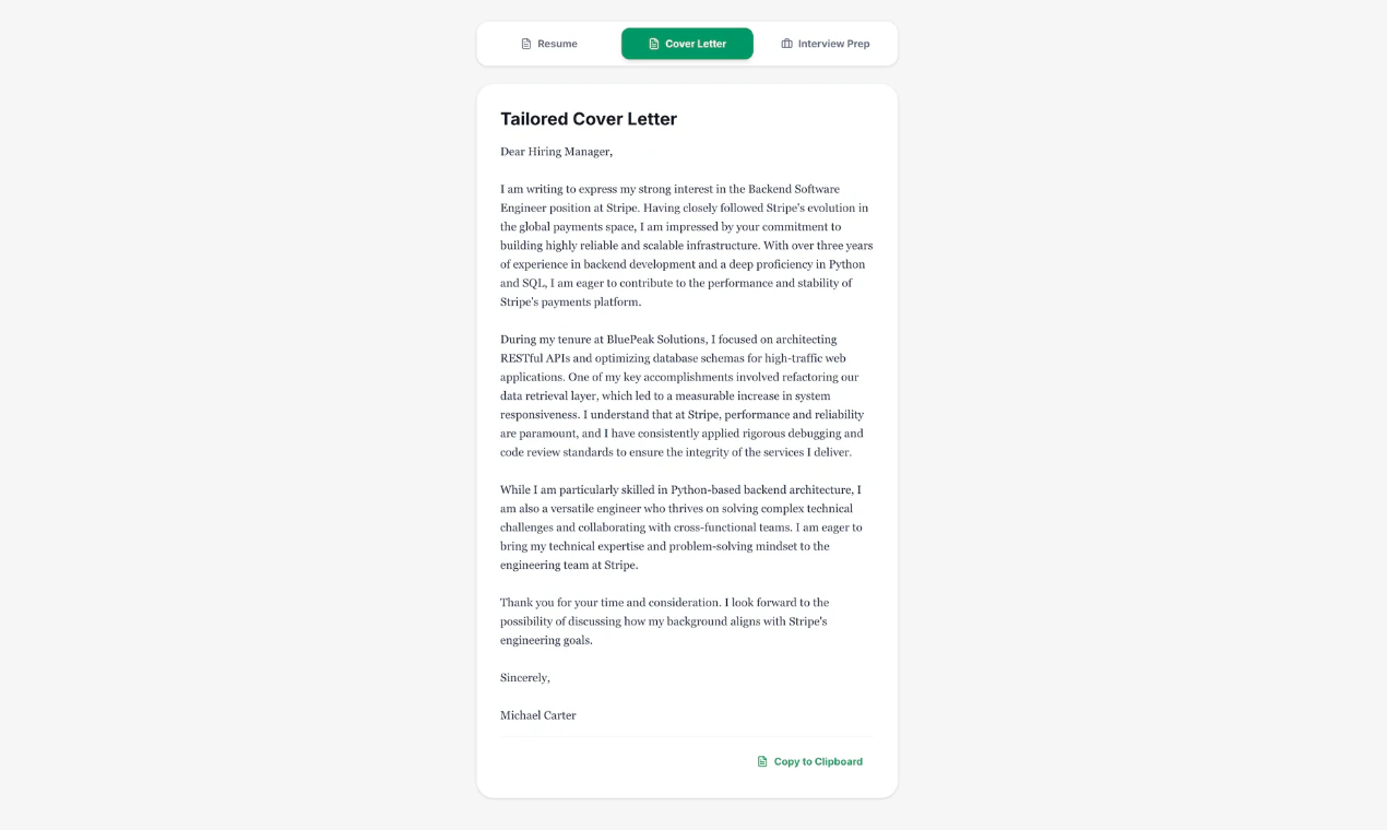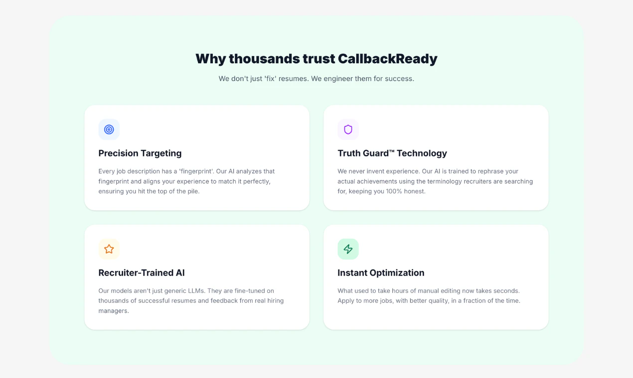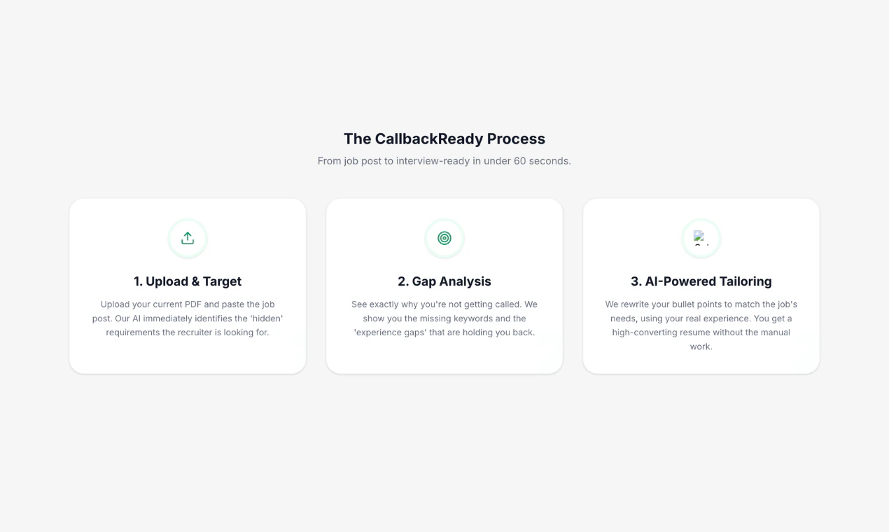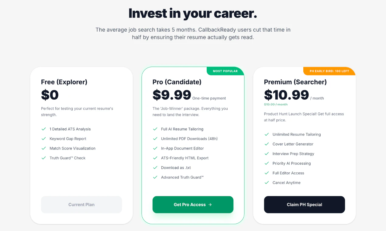 CallbackReady aligns your resume to job descriptions using recruiter-trained AI. We don't just fix keywords; we rephrase your actual experience to match what hiring managers are looking for. 🎁 PRODUCT HUNT SPECIAL: The first 100 users to upgrade to Premium get it for just $10.99/mo (50% OFF) forever! This includes unlimited tailoring, cover letters, and interview prep. Cancel anytime.