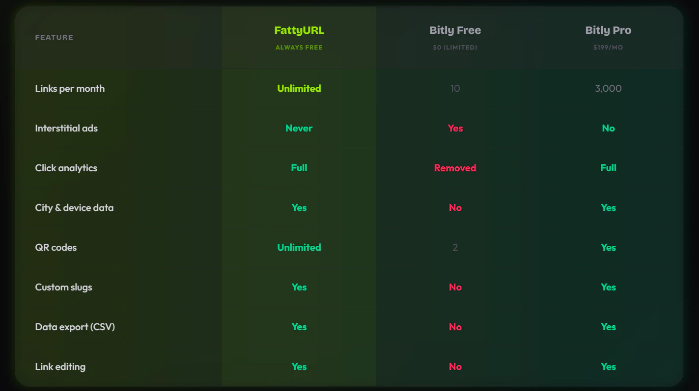 FattyURL is a free link management tool. Shorten any URL instantly — no signup needed. Full click analytics: countries, cities, devices, browsers, OS, referrers. Custom QR codes with color picker and PNG/SVG export. Custom slugs like fattyurl.com/your-brand. Link editing. CSV export. Import from Bitly via CSV. No ads. No interstitial pages. No usage limits. No premium tier. Links never expire — backed by a public promise.