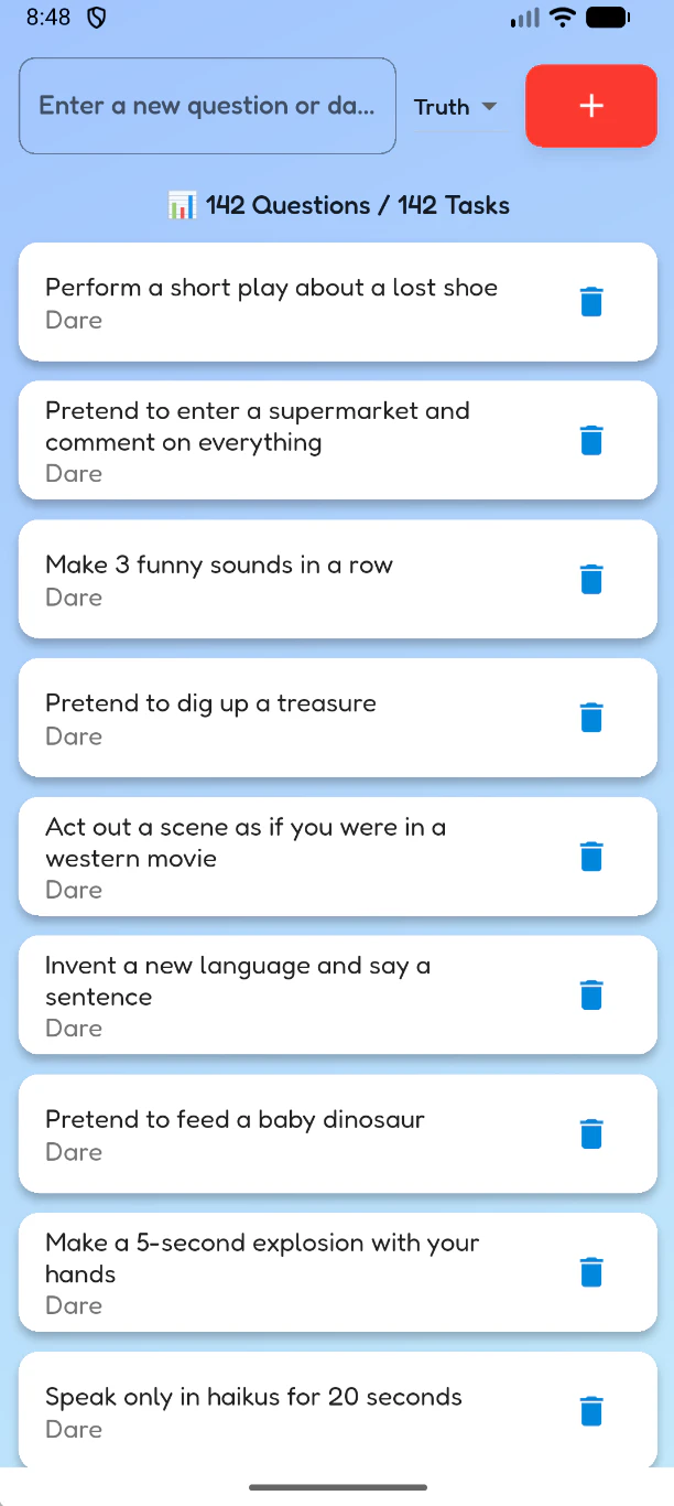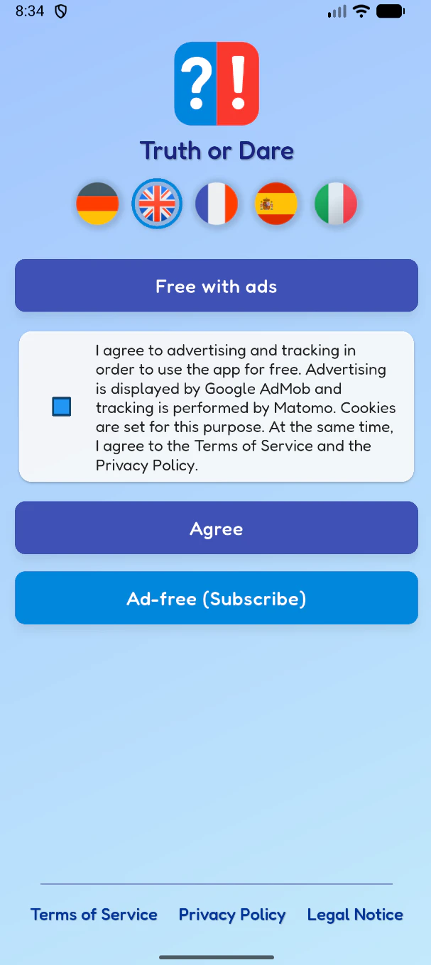 π TRUTH OR DARE β the only OFFLINE party app with ZERO tracking! Spin the wheel, pick π― βTruthβ or βDareβ and laugh out loud with friends, couples or the whole party. β’ 284 built-in cards β’ π UNLIMITED custom questions & dares β’ 100 % privacy-friendly β Premium = ad-free & tracking-free HIGHLIGHTS π 5 languages in ONE app (EN, DE, ES, FR, IT) β switch in 1 tap π‘οΈ ZERO Google-Analytics, ZERO cookies (Premium)