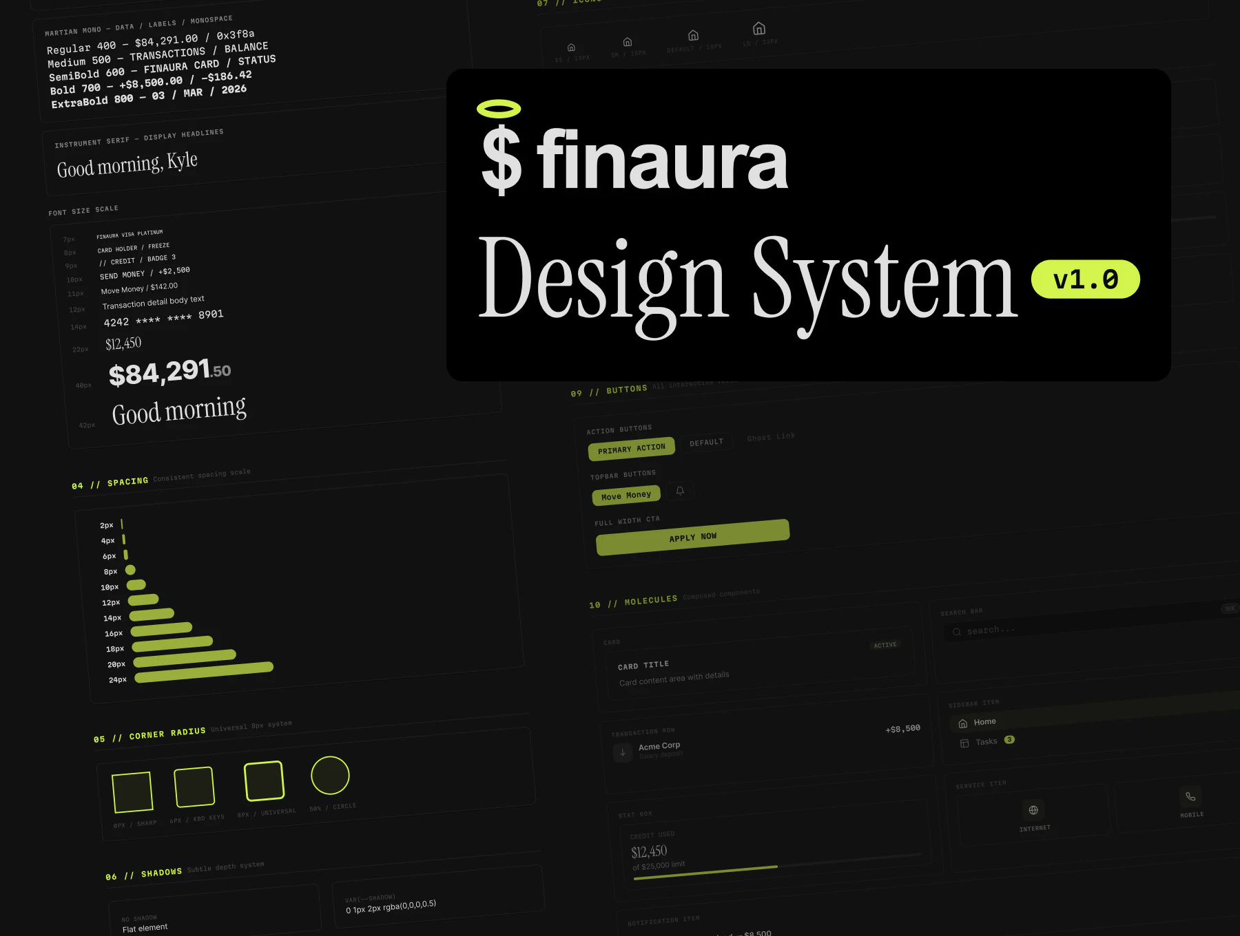 Finaura is a refined finance dashboard UI kit built for fintech startups, neobanks, and SaaS platforms. With 60 ready-to-use screens covering core banking flows — from onboarding to analytics — it delivers a production-ready foundation. A consistent token system enables effortless theming, while Instrument Serif, Martian Mono, and Inter create a premium fintech aesthetic. Includes cards, transfers, payments, credit tools, insights, subscriptions, settings, notifications, and support flows.