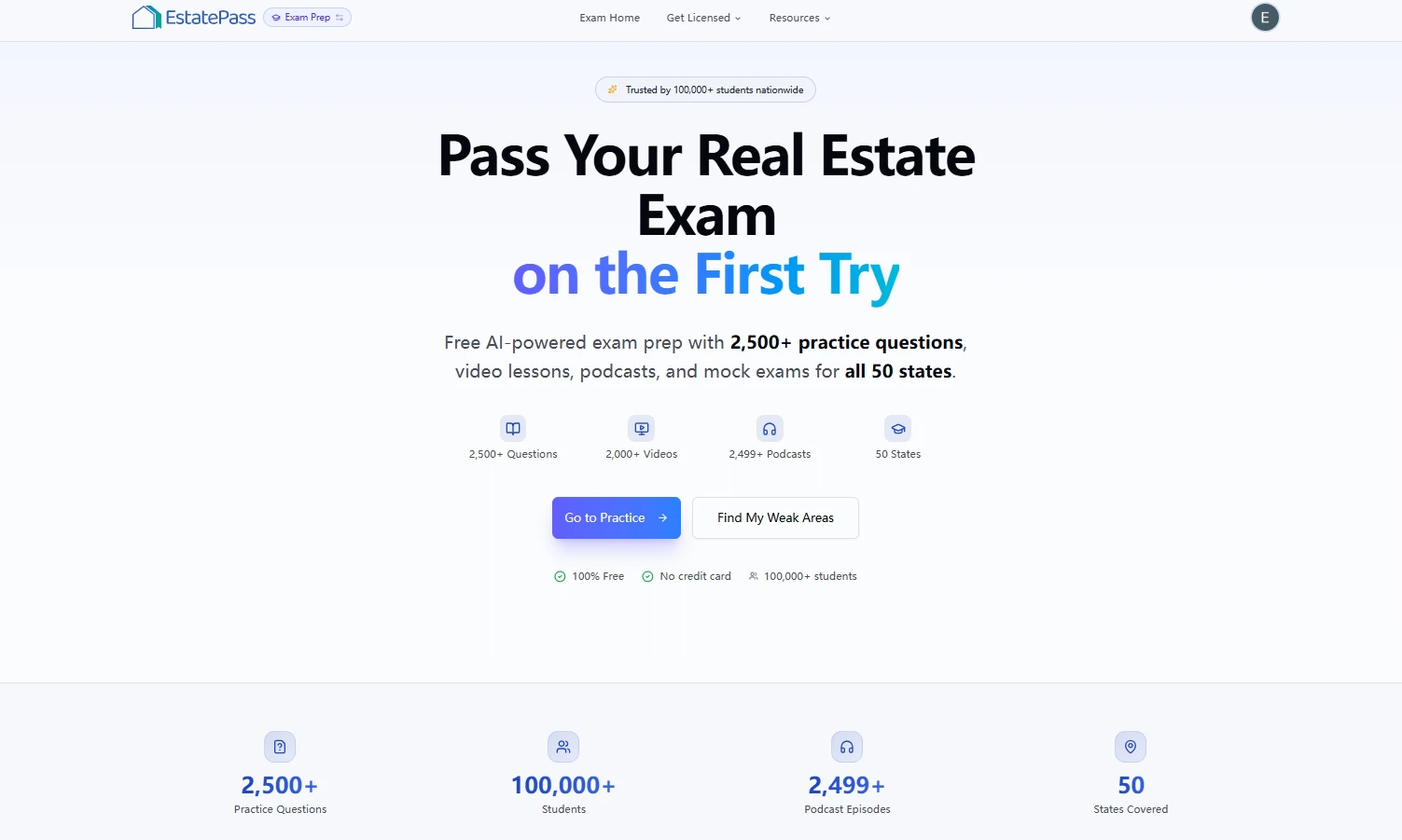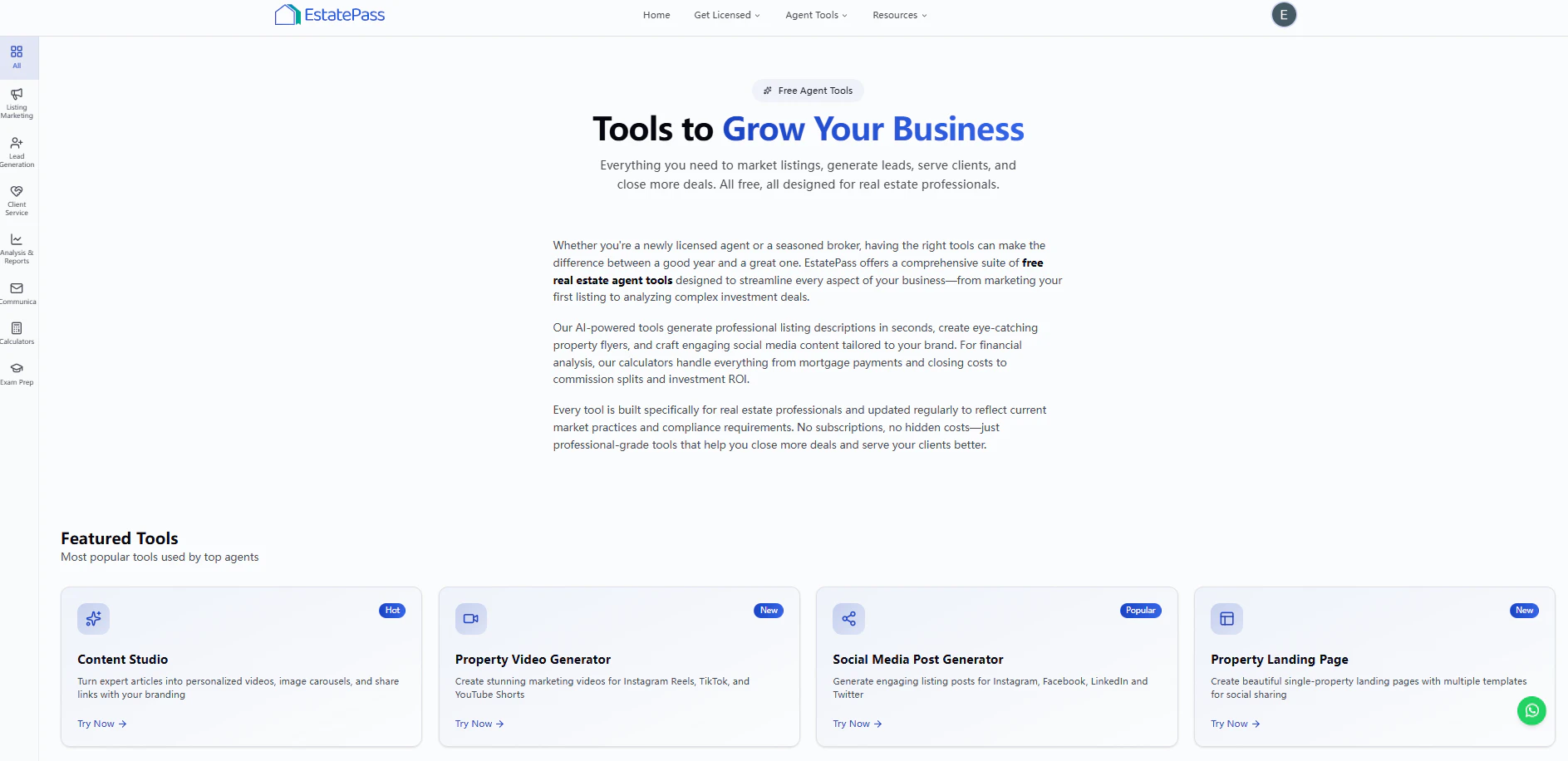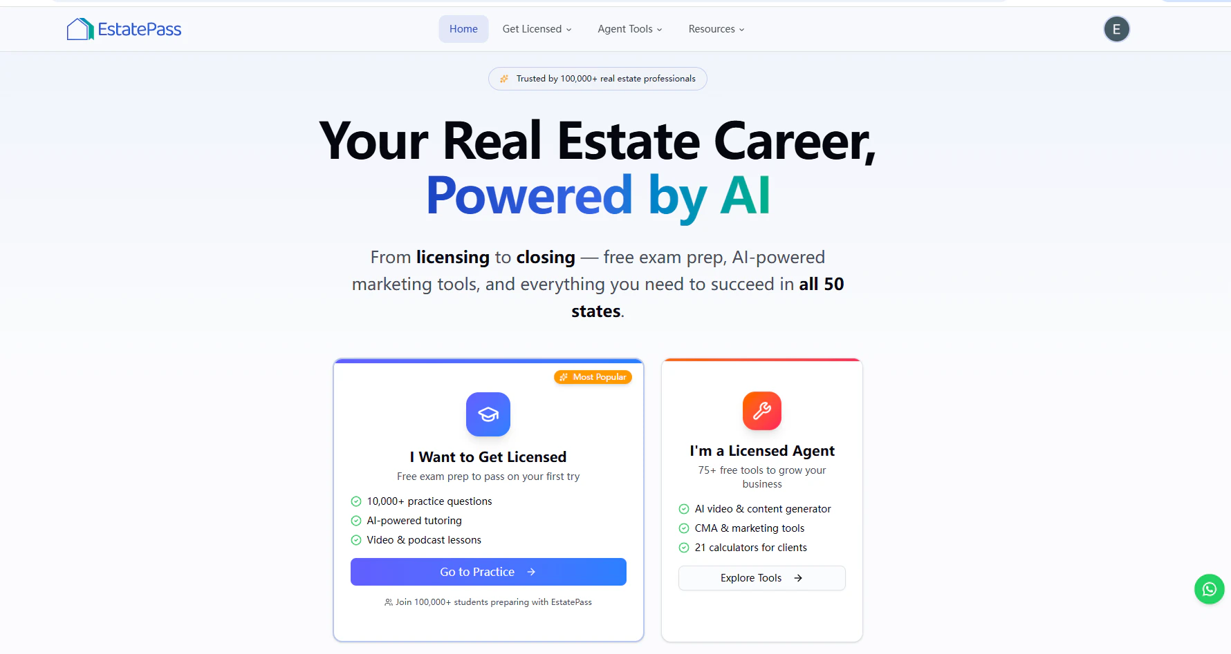 Pass the U.S. real estate licensing exam faster with EstatePass—state-specific prep for all 50 states, mock exams, progress tracking, and an AI tutor that explains answers clearly. After you’re licensed, keep using EstatePass to serve clients and close more deals with 75+ free agent tools: AI marketing/content generators, lead generation and transaction tools, and 21 calculators for real-world scenarios (commission, mortgage, closing costs, ROI, cap rate, and more).