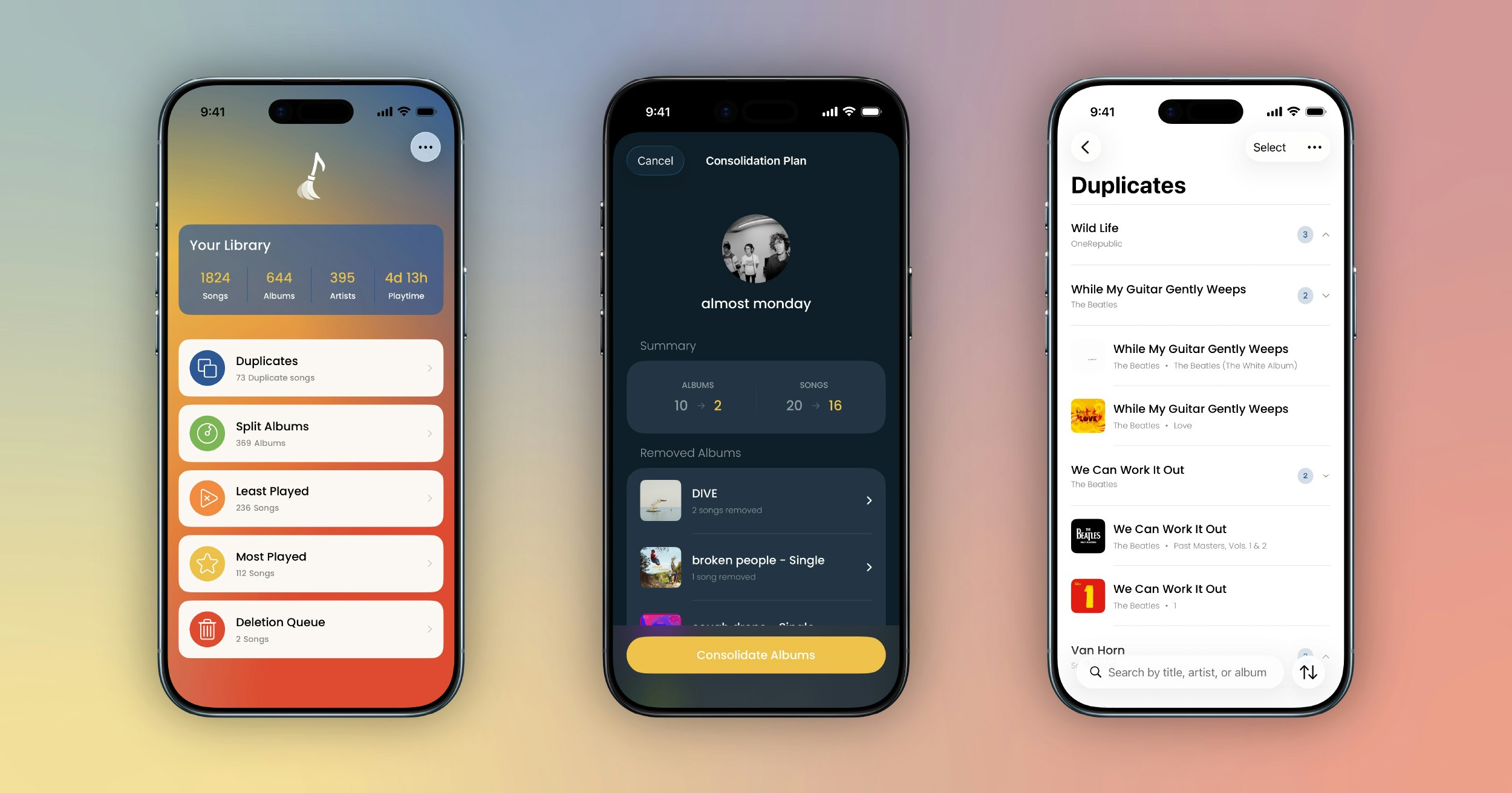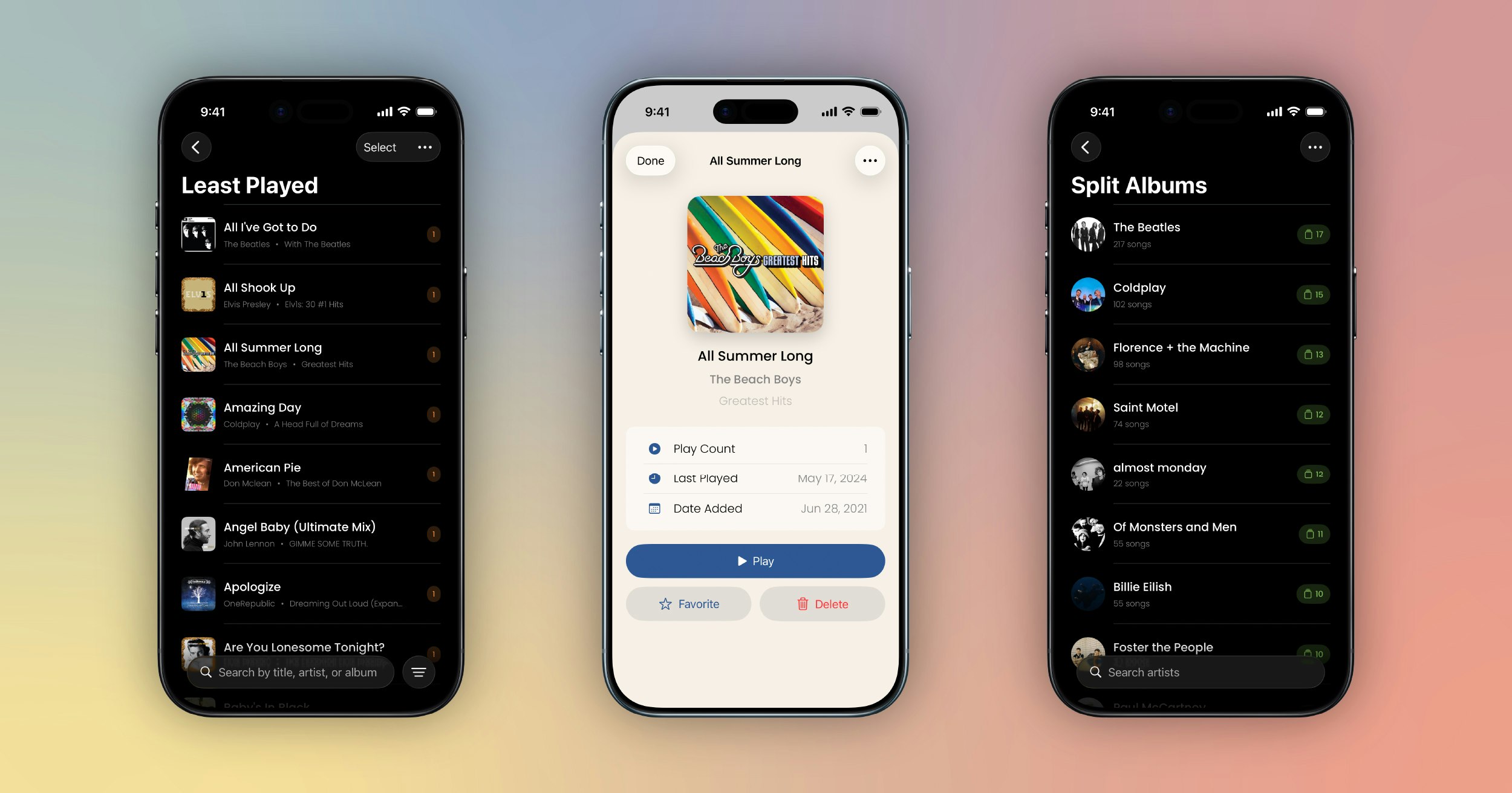 Song Sweeper is a first-of-its-kind iPhone app for cleaning up messy Apple Music libraries. It finds duplicate songs across different albums, unifies album editions into one, surfaces songs you no longer listen to so you can remove them, and helps you favorite your most-played tracks to improve recommendations. Built specifically for Apple Music, Song Sweeper brings everything back into alignment — so your library reflects who you are today, not who you were 10 years ago.