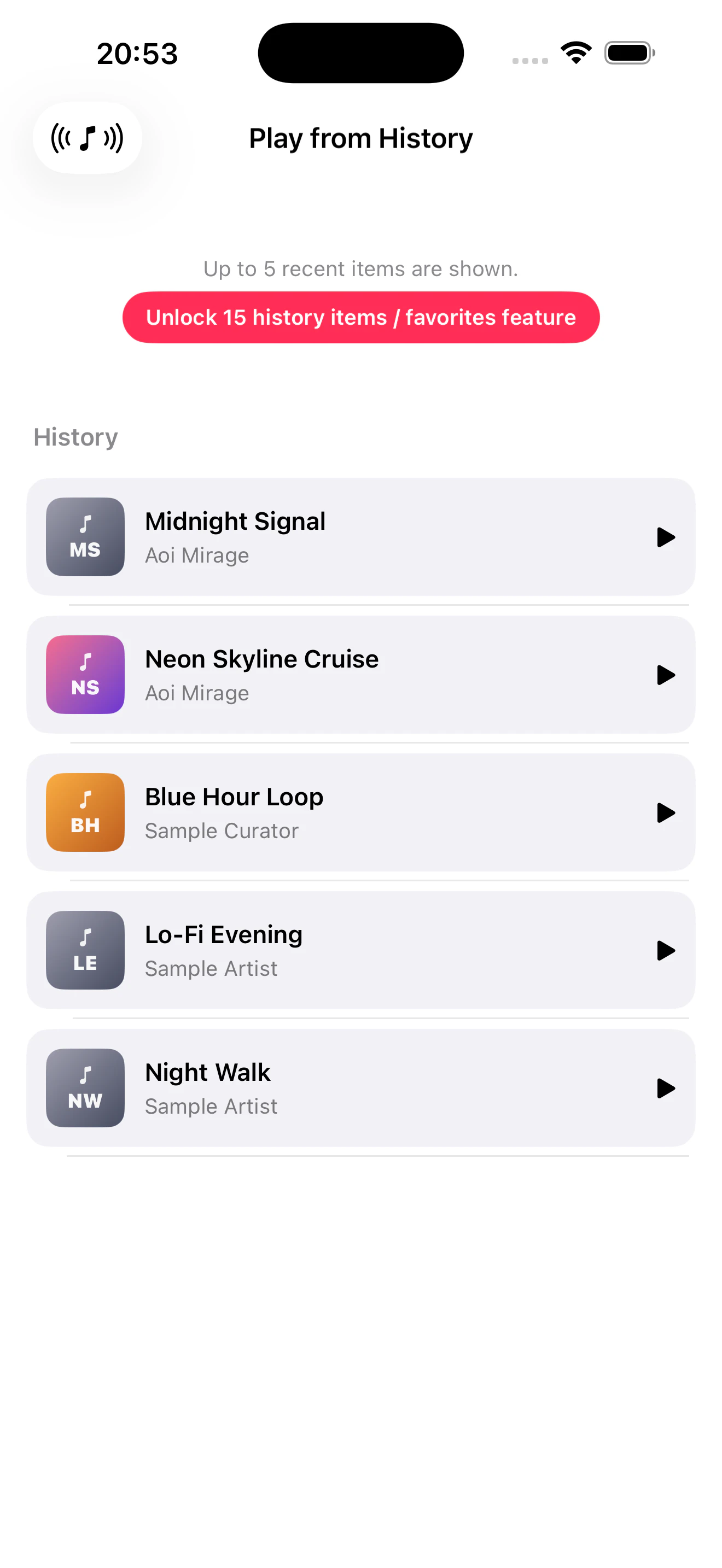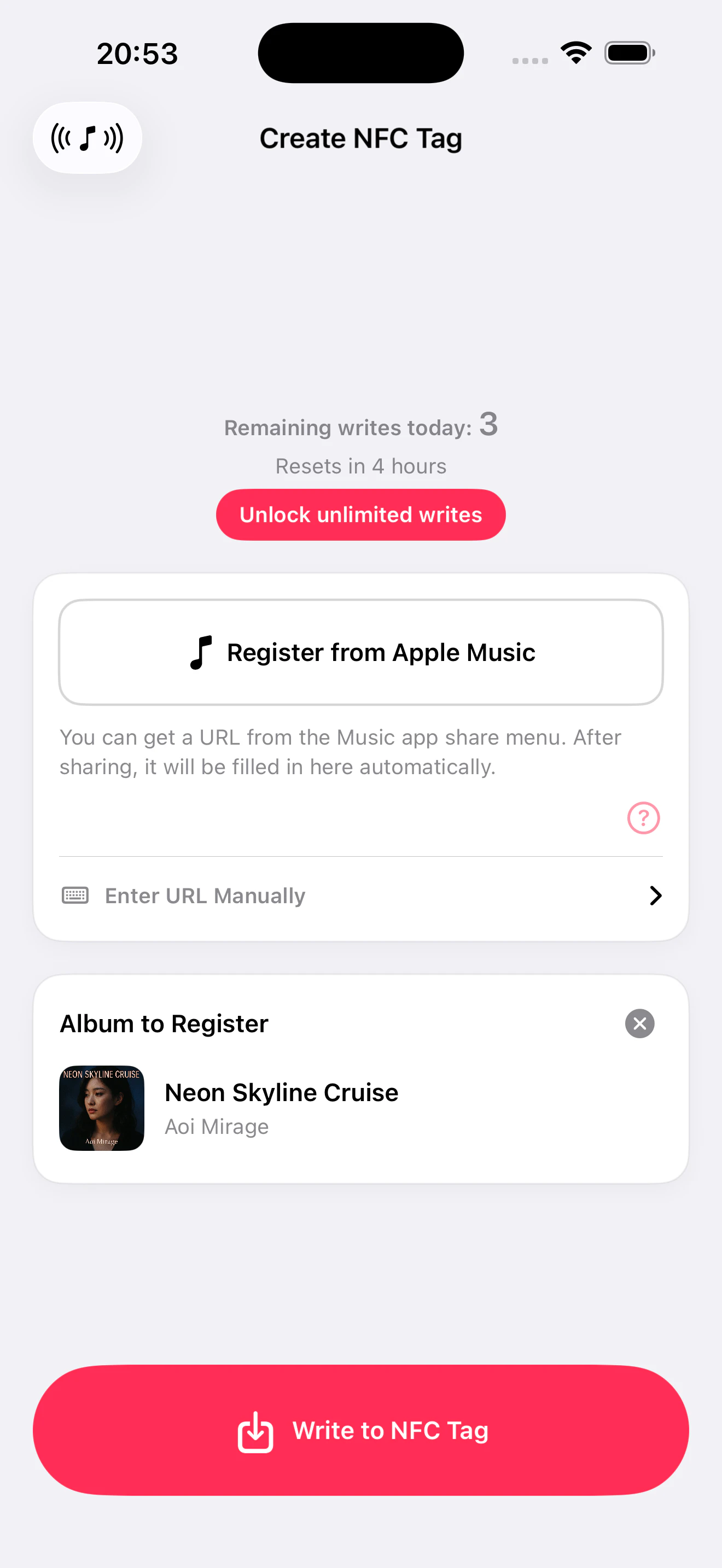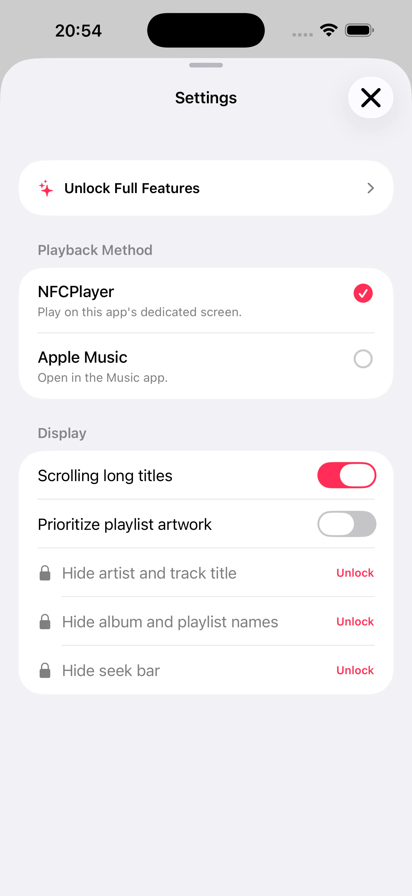 NFCPlayer lets you play Apple Music using NFC tags. Register a song, album, or playlist to an NFC tag and start music by tapping it with your iPhone. Place NFC tags anywhere to create physical music buttons for your desk, car, or speakers. Features: • Scan NFC tags to start playback • Write Apple Music URLs to NFC tags • Import URLs from the Music app Share menu • Simple playback interface • Playback history Free with optional in-app upgrades.
