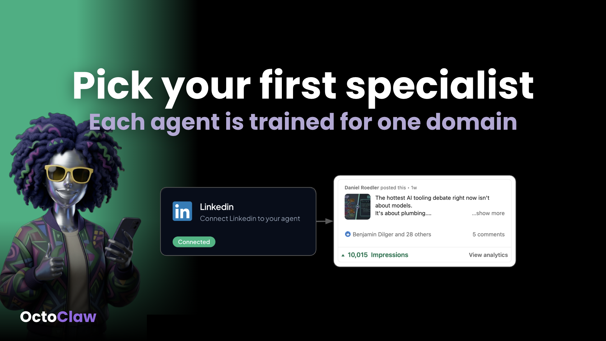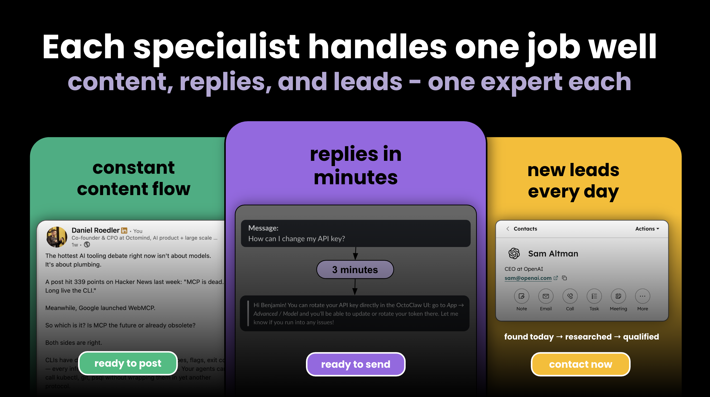 OctoClaw gives you AI specialists that actually execute business tasks - writing content, qualifying leads, replying to customers, and coordinating workflows across your tools.