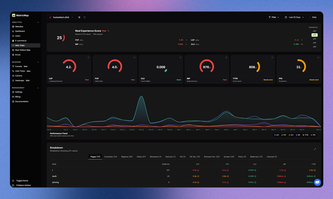 MetricMap.tech: The all-in-one analytics for SaaS & E-com founders. Stop juggling tools. Track Ads ROI, Revenue (Stripe/Paddle/Lemon Squeezy), and User Behavior in one dashboard. From Web Vitals and Error monitoring to real-time Visitor Maps—get a full view of your product health. Key Features: Ads & Revenue: Connect marketing spend to MRR/Sales. Tech Health: Monitor Web Vitals & Errors. User Insights: Sessions, Events, and Behavior. Privacy-first: Simple setup, no noise.