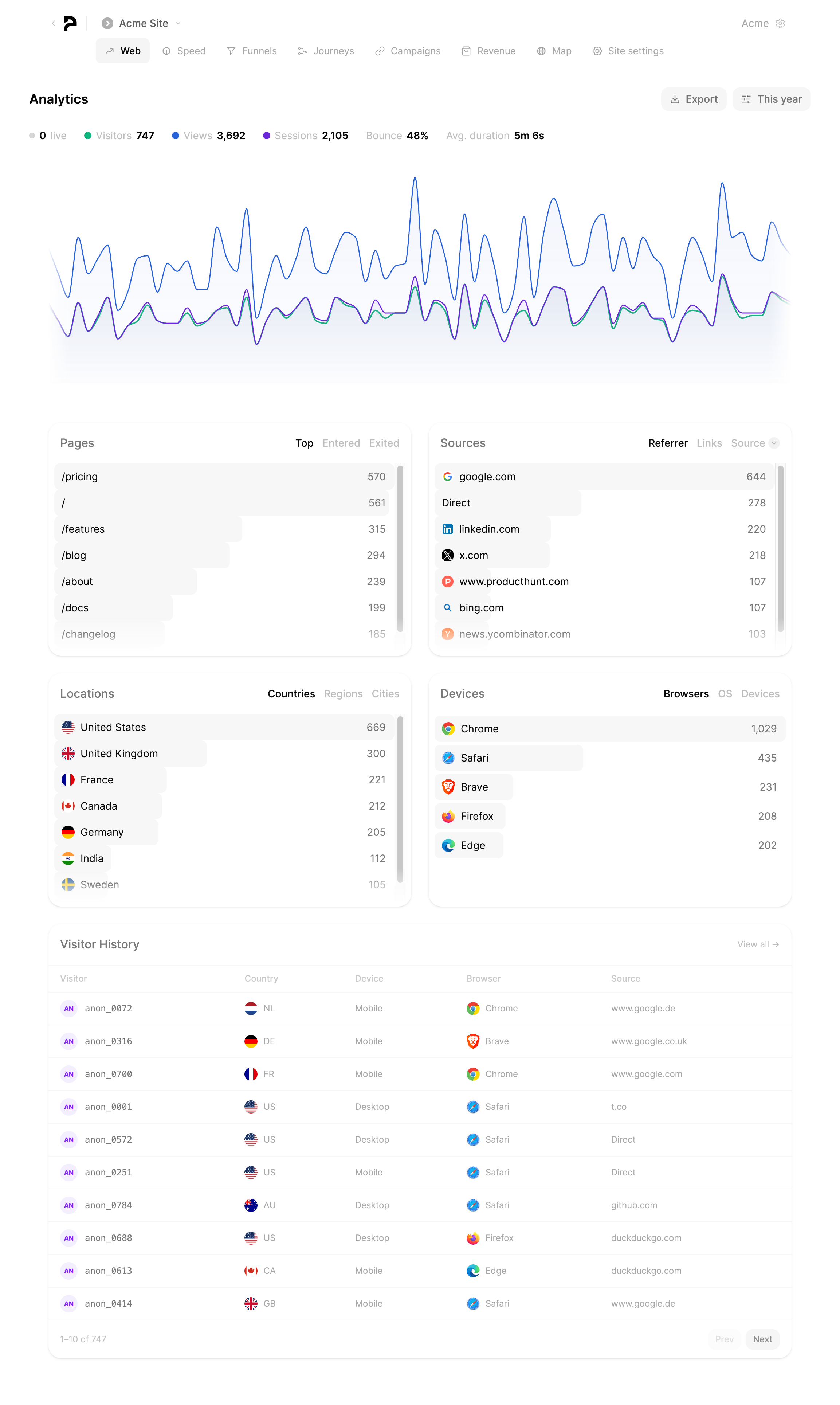 More features than the tools charging 3x the price. Meet Peek: real-time website analytics for people with a business to run. One script tag. Under 2KB. No cookies, no consent banners, no setup. See live visitors, browse individual visitor journeys, track page speed, monitor Core Web Vitals, and connect Stripe or Shopify to see which traffic actually makes you money. No GA4 complexity. No cookie banners. No bloat. Built for founders, not data teams. Free tier. No card needed.