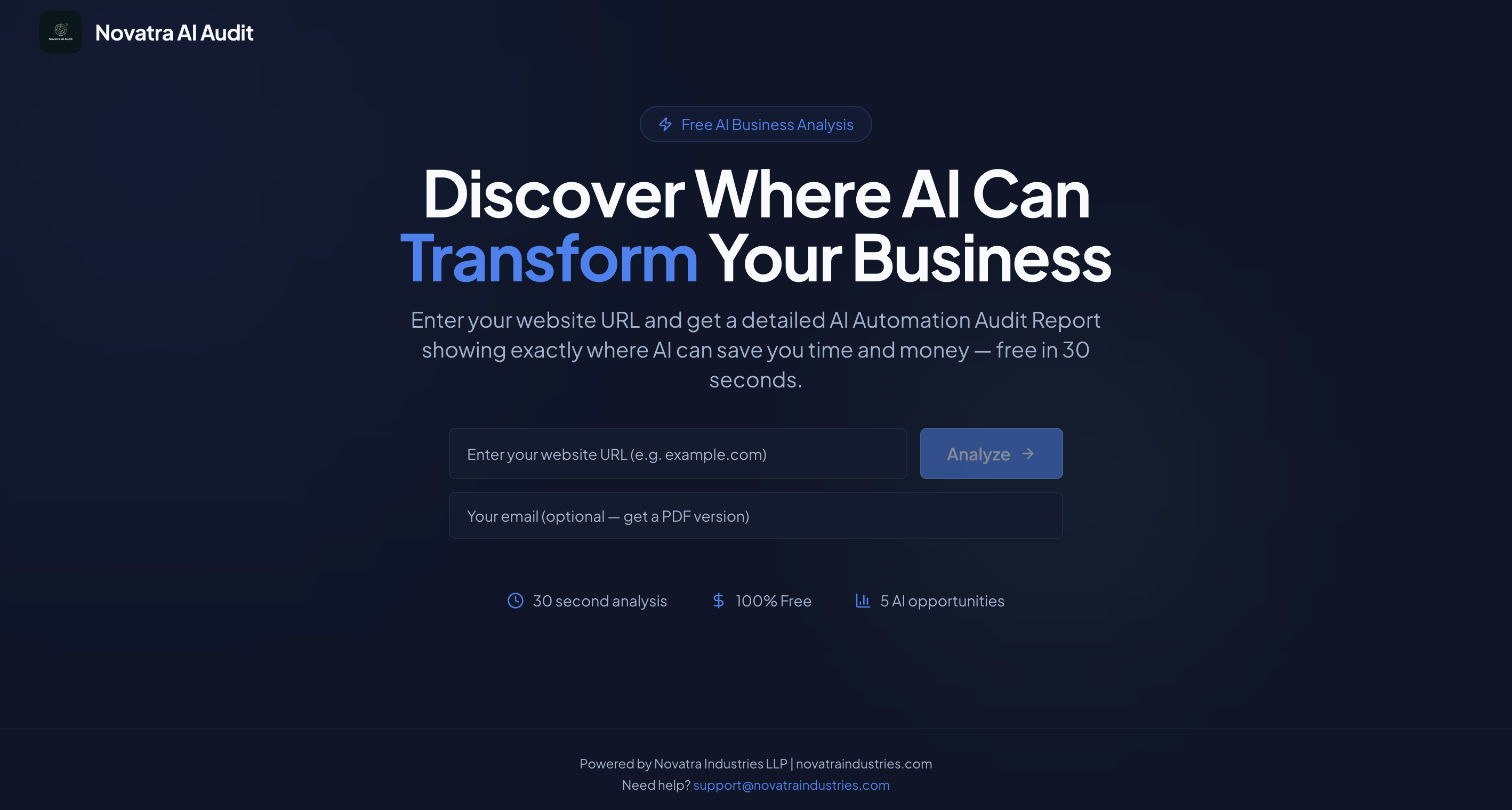 Most business owners want AI but don't know where to start. Novatra AI Business Audit fixes this. https://aiaudit.novatraindustries.com/ → AI reads your business → Get a custom report in 30 seconds: → AI Readiness Score (0-100) → Top 5 automations specific to YOUR business → Exact monthly savings in dollars → Which automation to implement first Real results: 🍽️ Dubai restaurant → $4,200/month found 🏢 Fortune 500 India → $85,000/month found Free. No signup. No credit card.