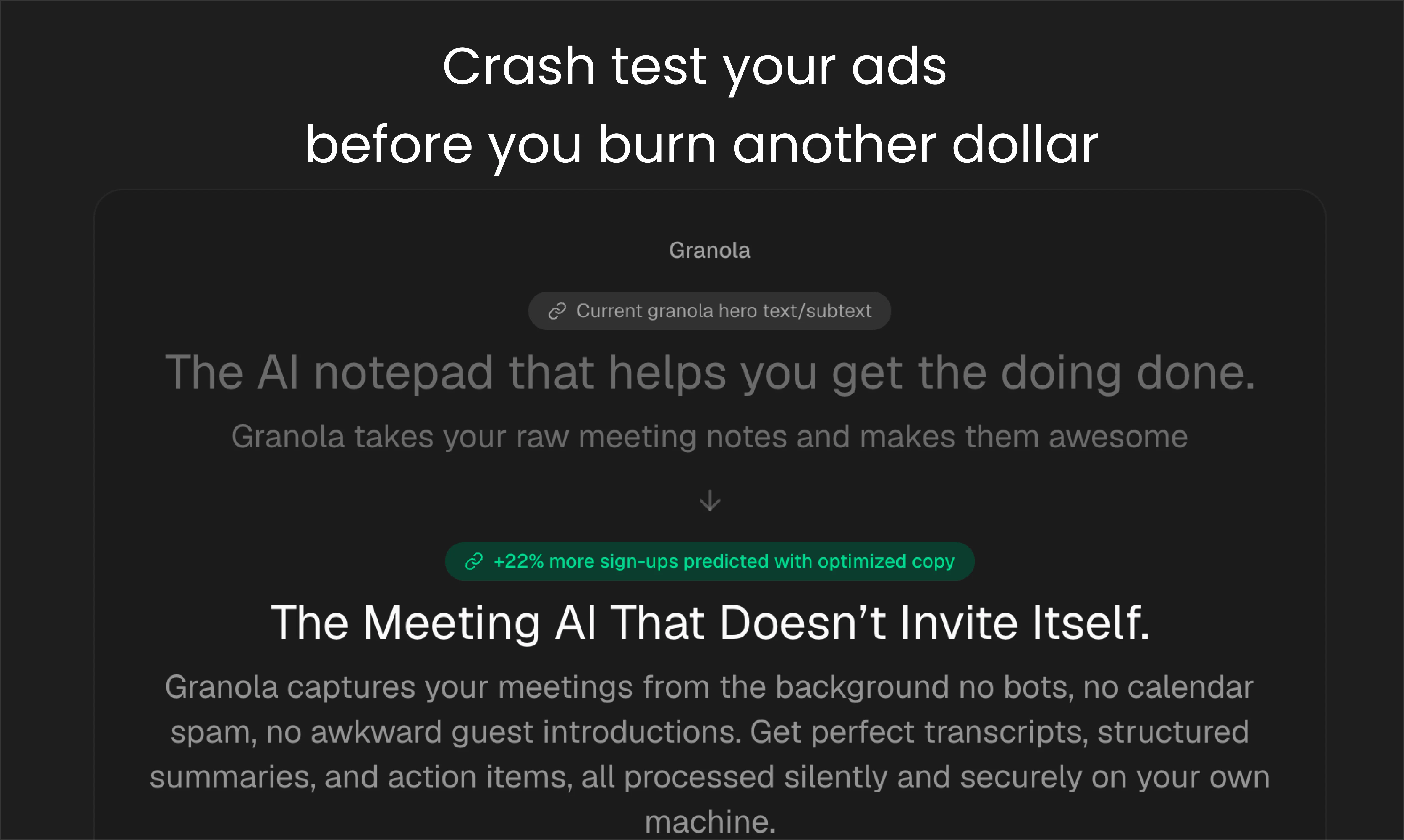 Crash Test Copy puts your words in a digital petri dish with 100+ ruthless AI buyers. It cross-breeds and mutates your message, killing off weak phrases and evolving the survivors into high-converting copy.