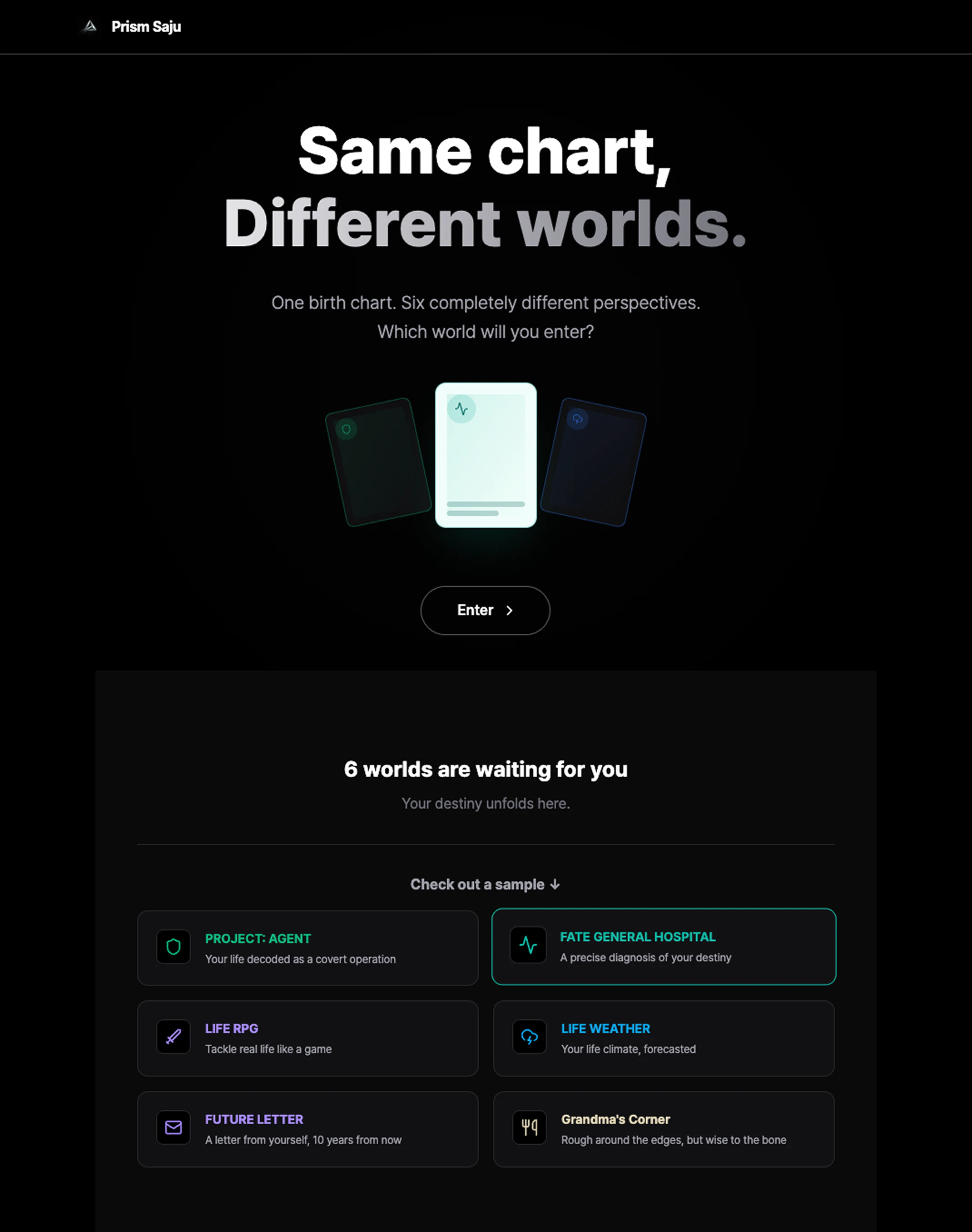 Prism Saju is a playful reinterpretation of Korean astrology (Saju), which analyzes personality and life patterns based on birth date and time. Instead of providing a single fixed reading, it expresses your destiny across multiple different story worlds. Same data, different narratives — each world reveals a different perspective of your personality, like seeing alternate versions of yourself.