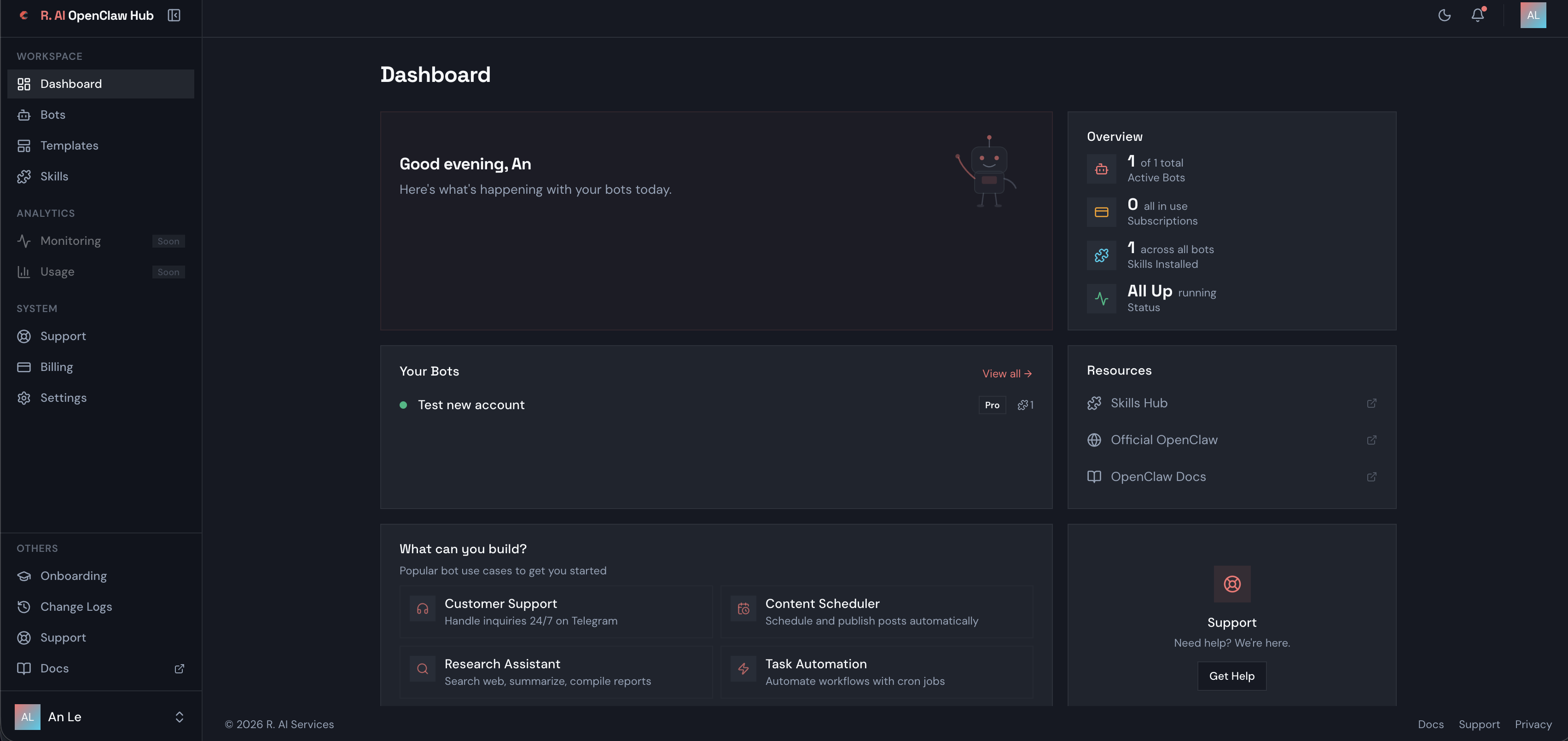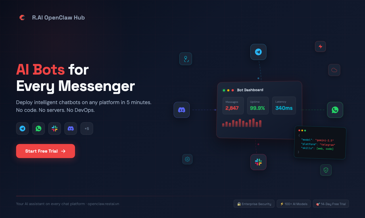 Your AI assistant on any messenger — fully managed. OpenClaw Hub bundles everything: VM, AI credits, monitoring, security — pick a messenger and deploy. • Deploy in 5 minutes — no servers, no DevOps • All-in-one — VM + AI credits + ops included • Enterprise cloud — private environment, encryption, zero data retention • Telegram, WhatsApp, Slack, Discord and more Personal assistant · Customer support · Team bot · Sales bot · Q&A bot 14-day free trial. No credit card.