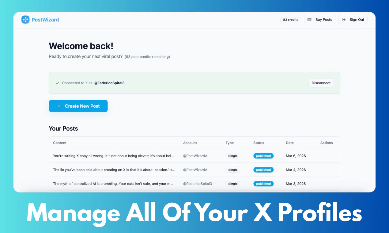 I’ve spent a decade in Twitter marketing, and I’ve learned one thing: quality beats noise. I built PostWizard to automate that philosophy. Stop struggling with "AI-sounding" tweets. PostWizard acts as your elite ghostwriter, turning simple ideas into high-retention X threads. Framework-Driven Hooks: Based on real-world viral structures. Rapid Workflow: Create and schedule your entire thread in just 2 clicks. Multi-Account Support: Build your personal and company brands simultaneously.