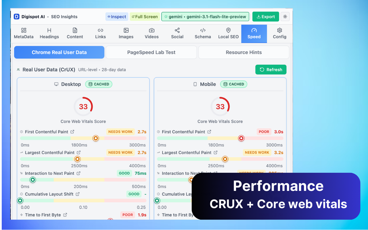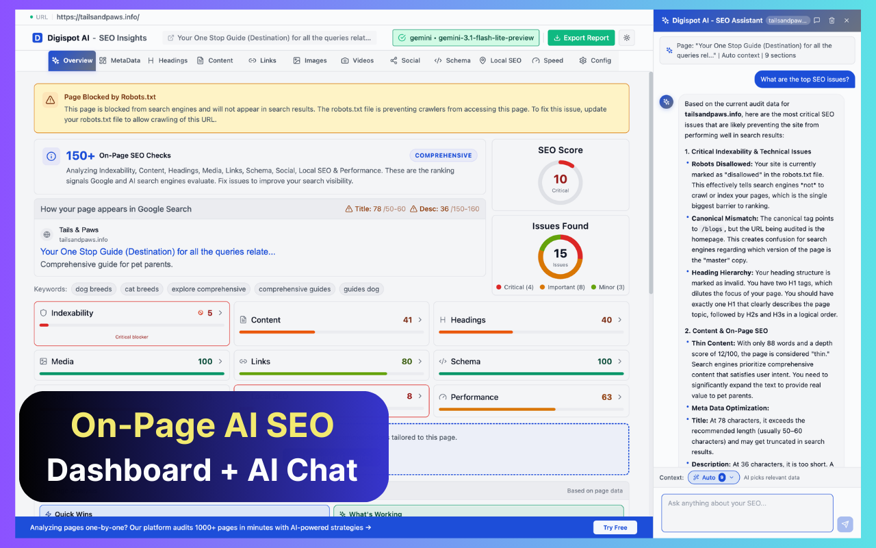150+ SEO & AEO Checks, SERP Analysis, AI Chat