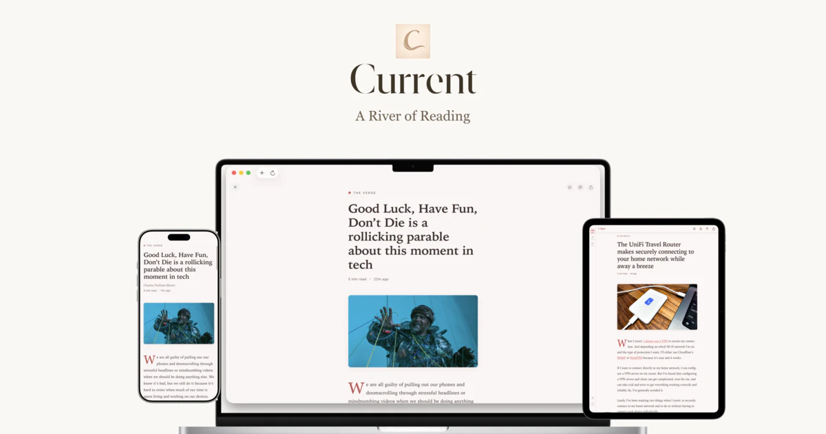 Current rethinks RSS for the modern reader. Your feeds flow like a river. No inbox anxiety, no unread counts. Just beautiful reading that respects your attention.