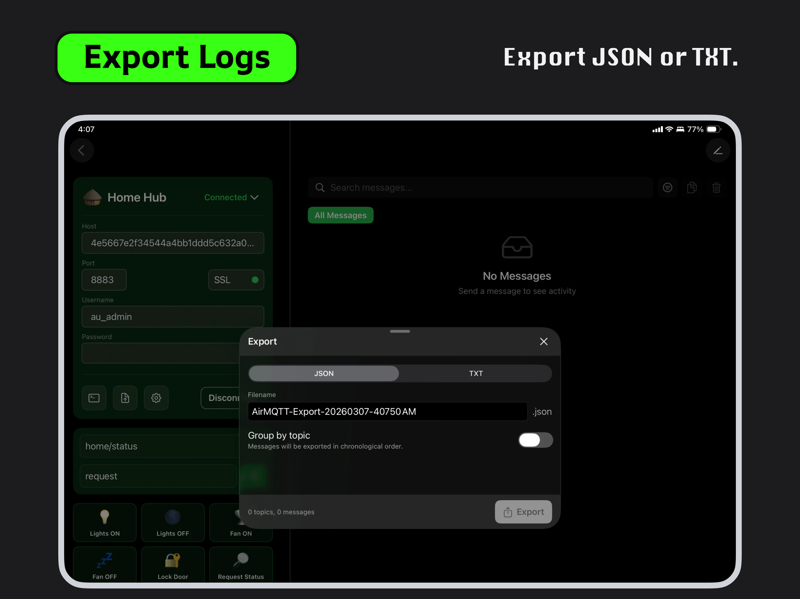 AirMQTT is a native MQTT client for macOS, iPhone, and iPad. Monitor live topics, publish payloads instantly, save reusable quick actions, and manage multiple brokers with a clean, focused workflow. Supports MQTT 3.1.1 / 5.0, TCP / WebSocket, filtering, search, export, and private iCloud sync — with no account required.
