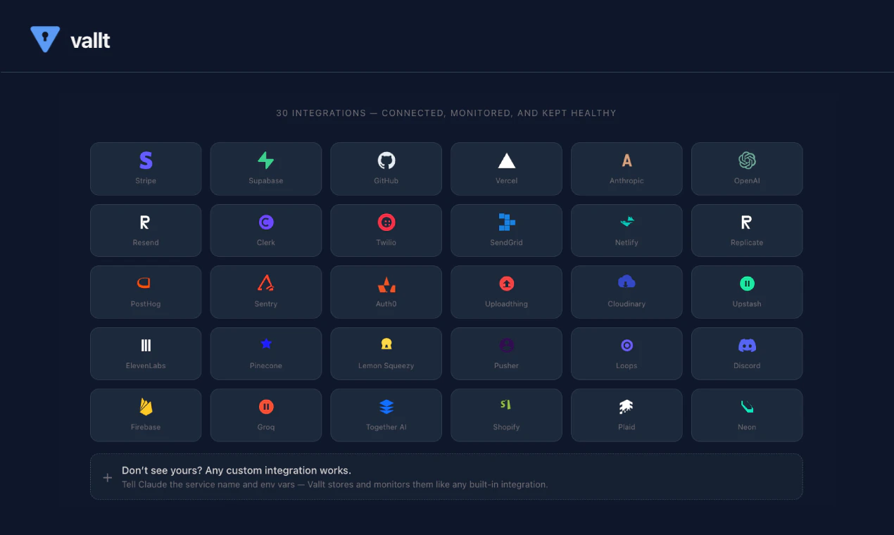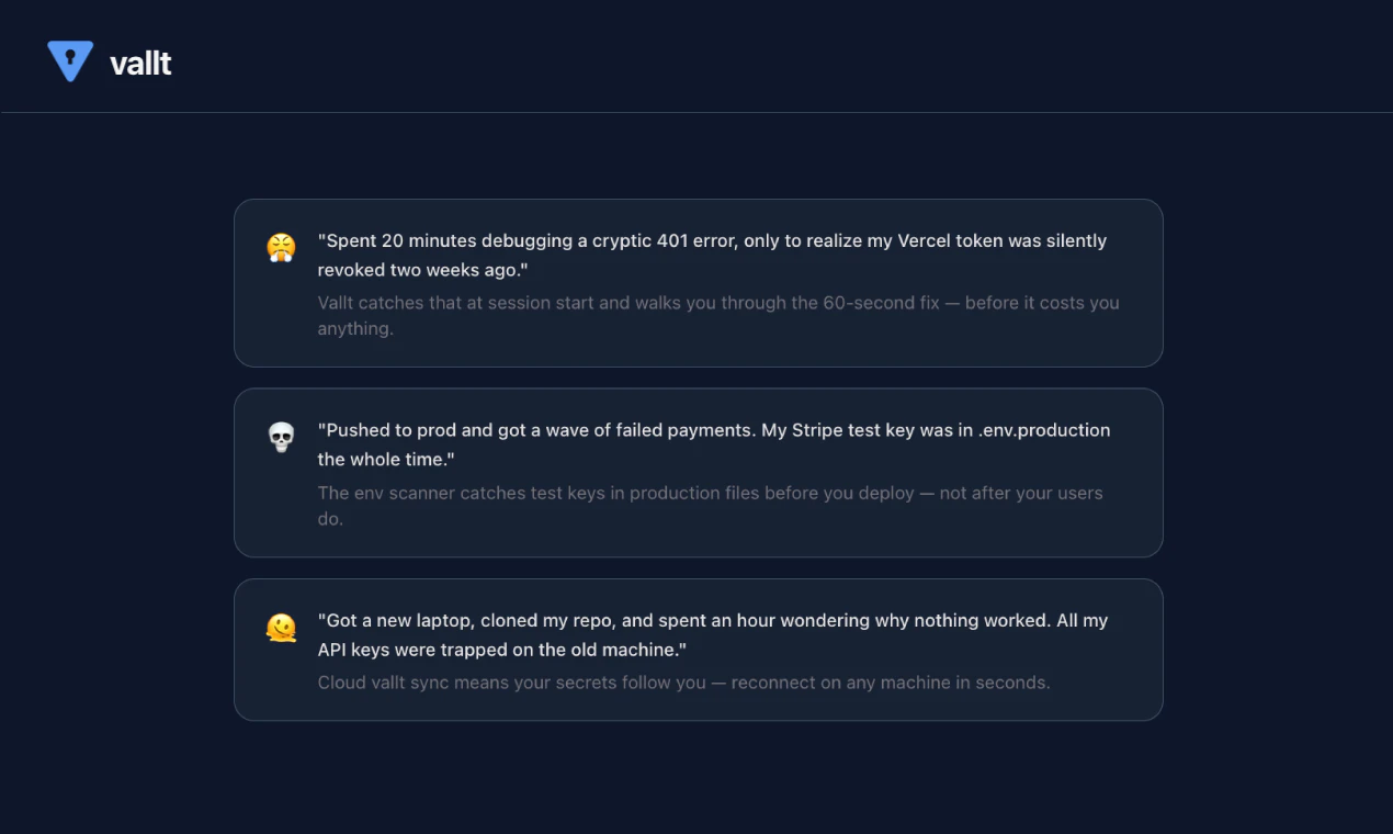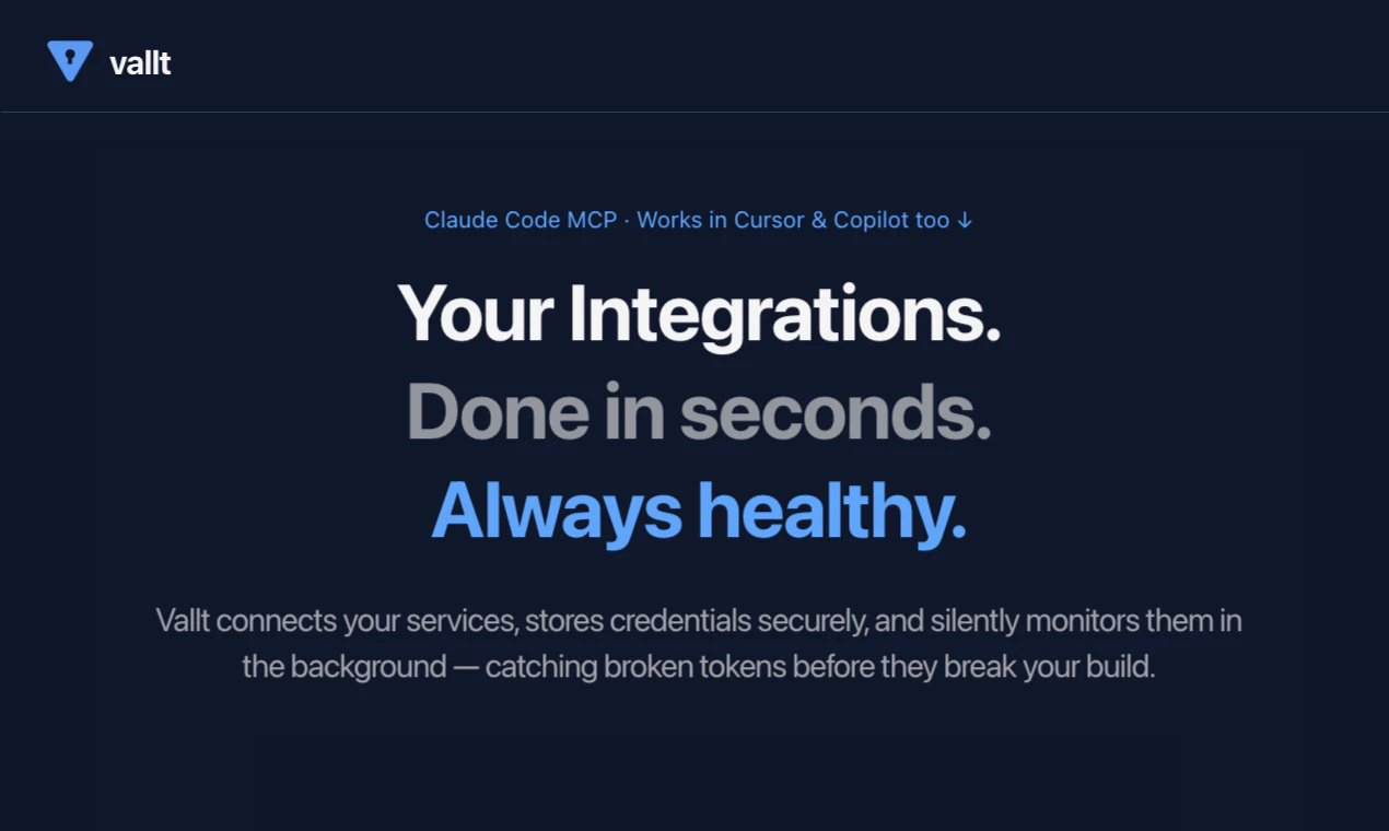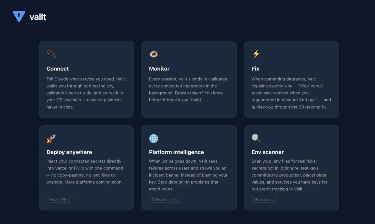Made for vibe coders who want to ship, not spend hours hooking up API keys. Vallt connects, monitors, and keeps them healthy so you never have to think about them again. Vallt is an MCP server for Claude Code that connects your APIs in seconds, stores credentials in your OS keychain, and silently monitors them every session. Broken token? You know before it breaks your build. It also scans yourenv files for real risks, and detects platform outages before you waste time debugging them.