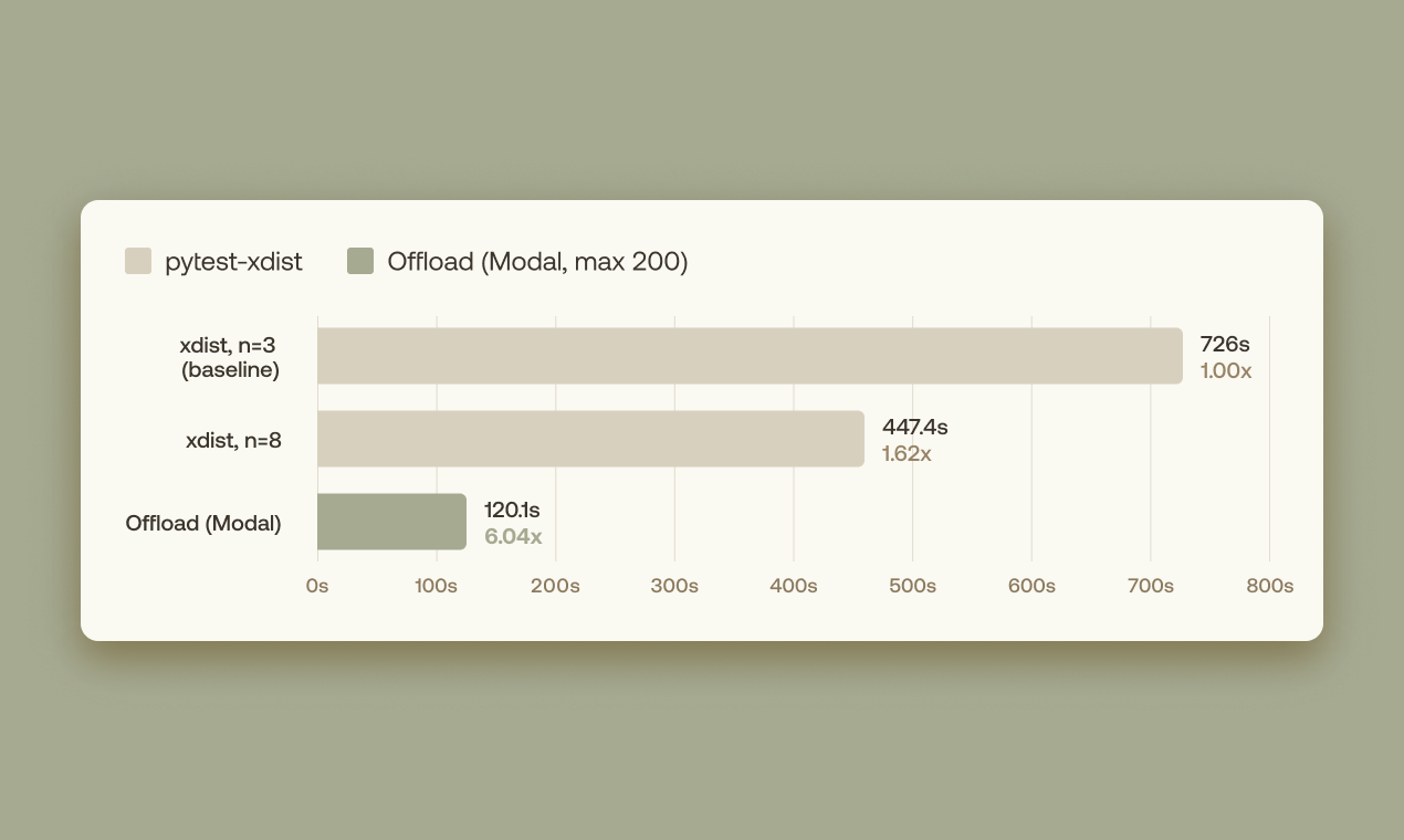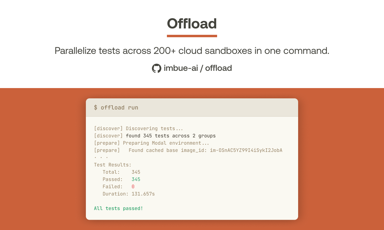 We built Offload after watching an agent wait 10 mins for an integration run to finish. When you're running parallel AI coding agents, the test suite is where the loop stalls. Agents queue behind a test lock or race for local resources to return flaky results. Offload is an open-source Rust CLI your agents invoke directly. It spreads your test suite across 200+ isolated cloud sandboxes. One TOML config, no test rewrites. On our Playwright suite, it took a 12 mins run to 2, at $0.08 per run.