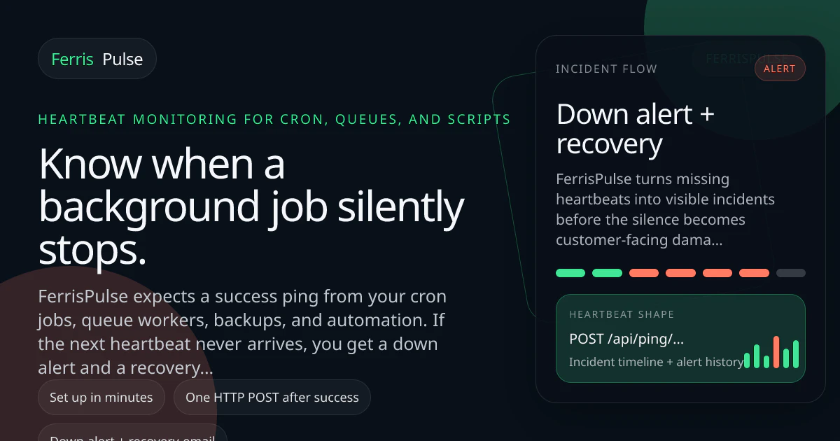 Most apps don’t fail loudly — they fail silently. FerrisPulse helps you detect when background jobs stop running using simple heartbeats. No dashboards, no complexity. Just instant alerts when something breaks quietly.