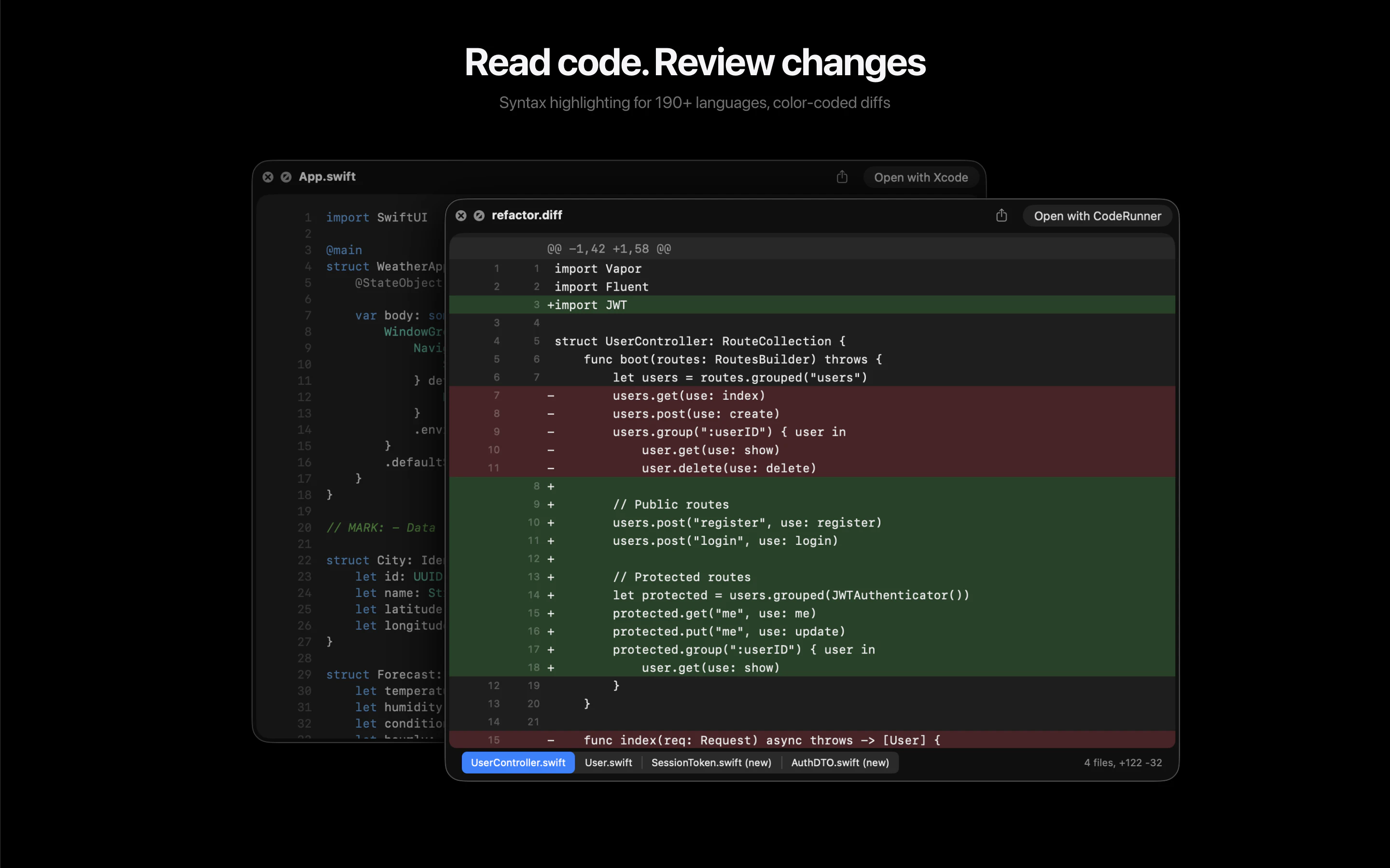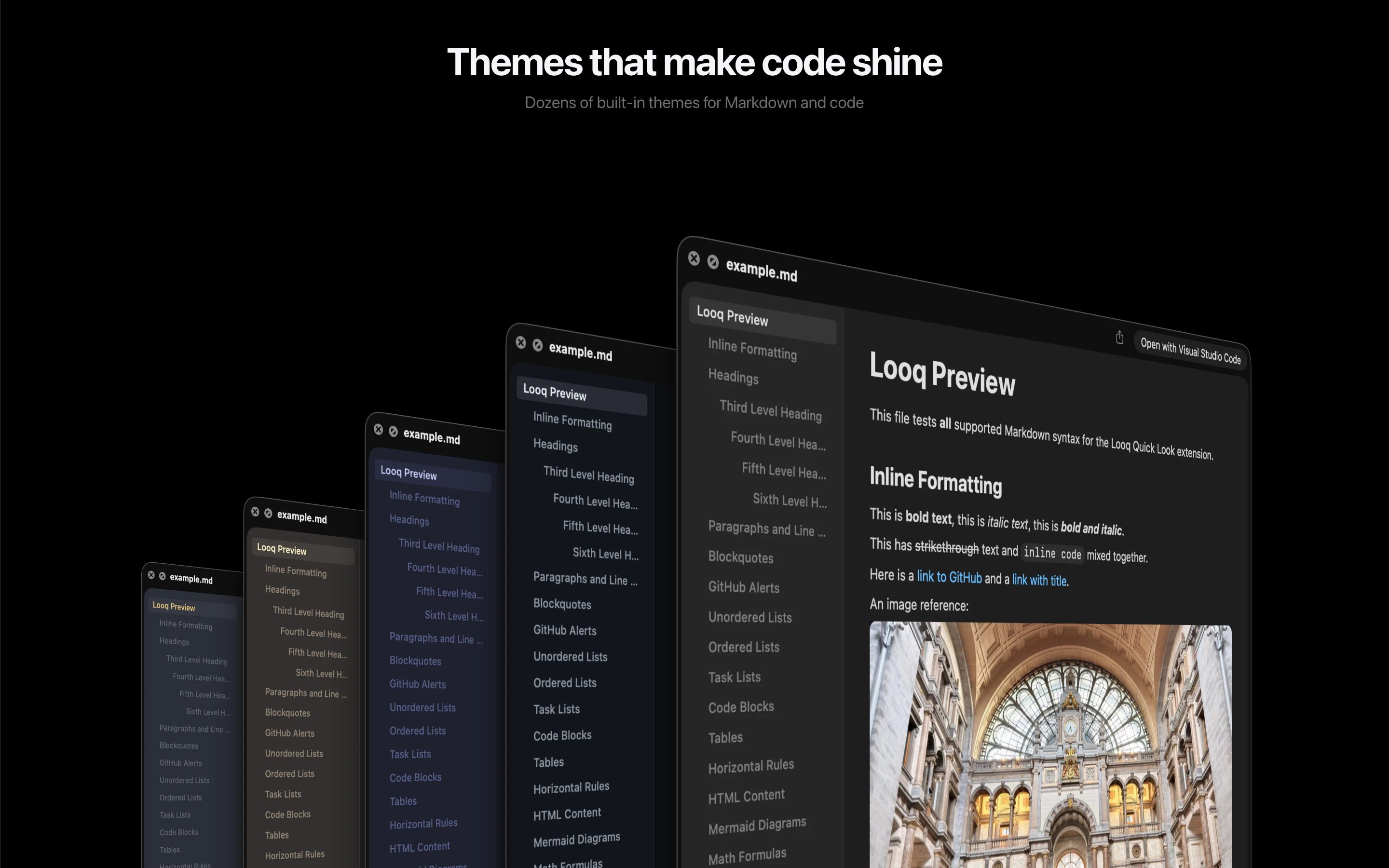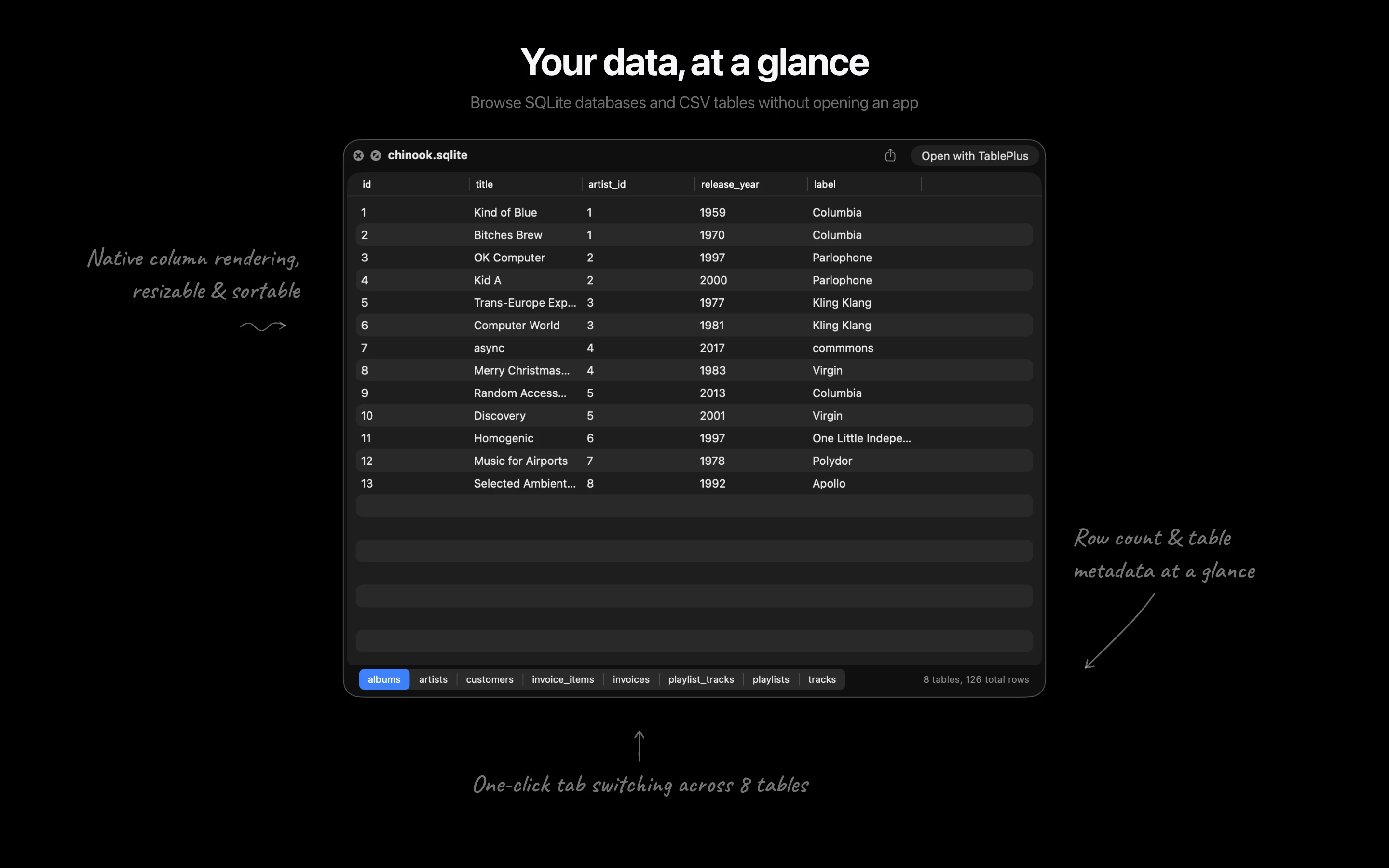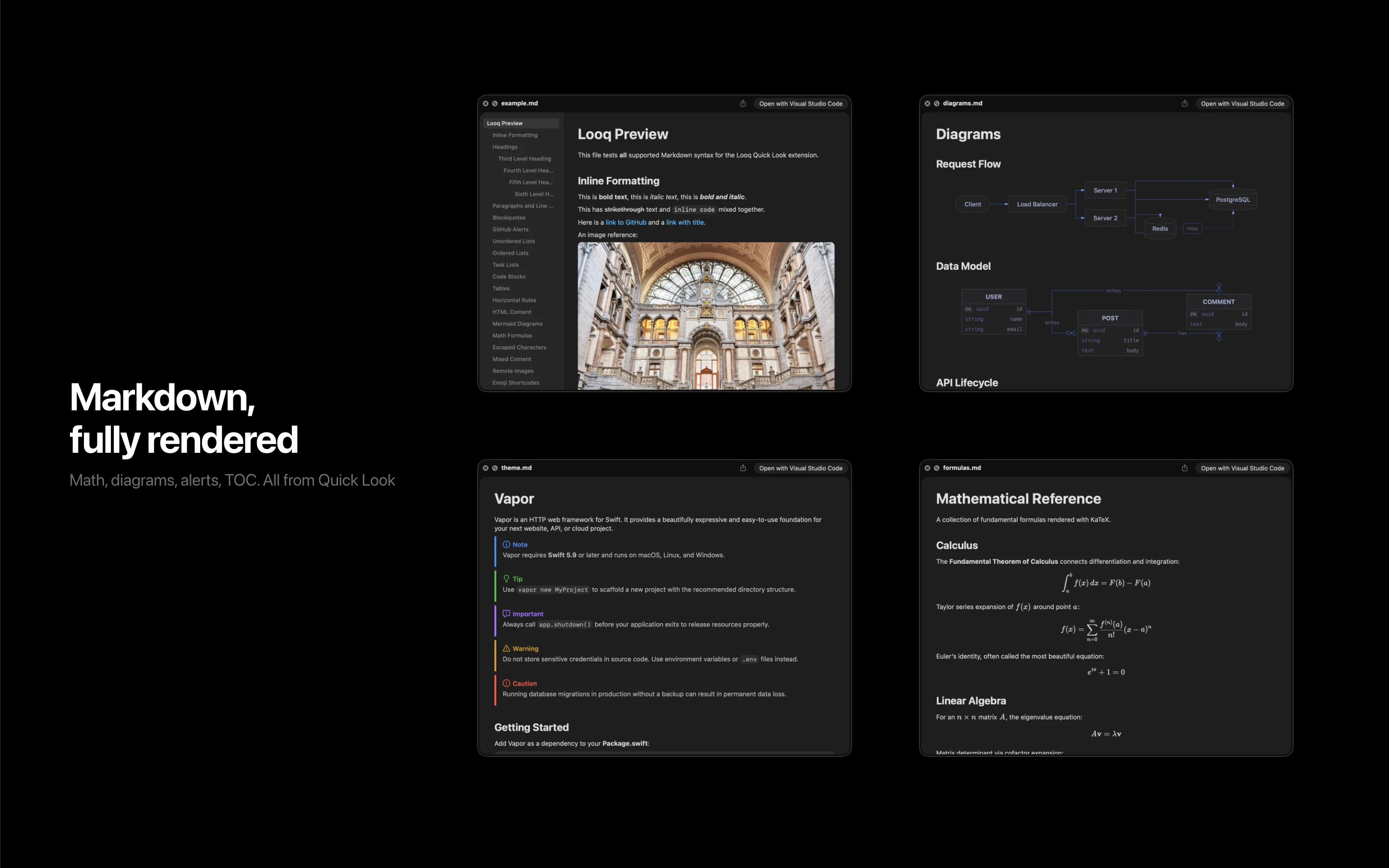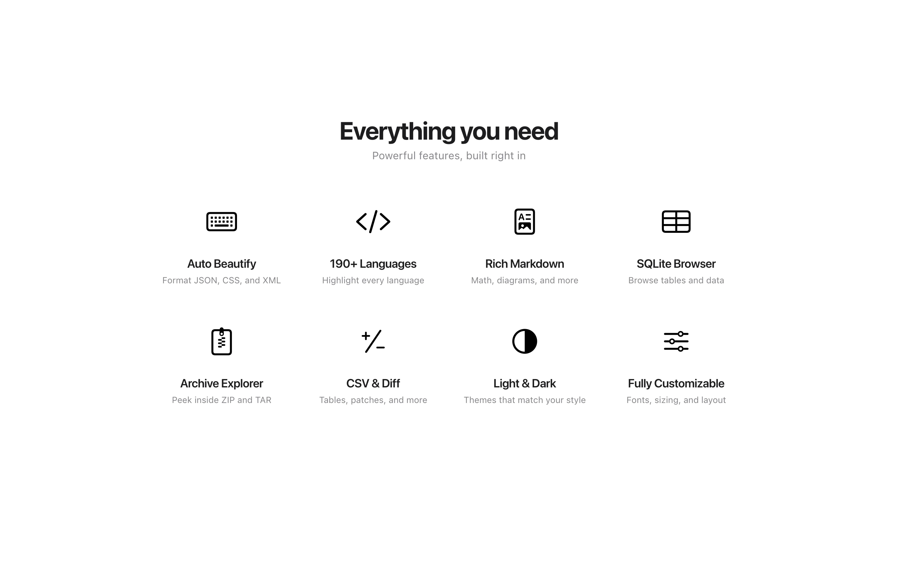 A better look at your files. Preview Markdown with KaTeX and Mermaid, highlight 190+ languages, view CSV and SQLite tables, browse archives and folders. All from Quick Look.