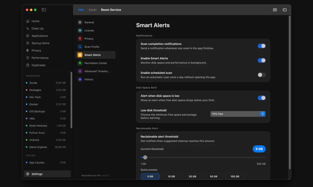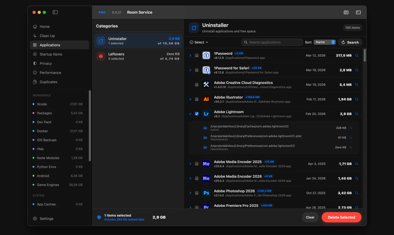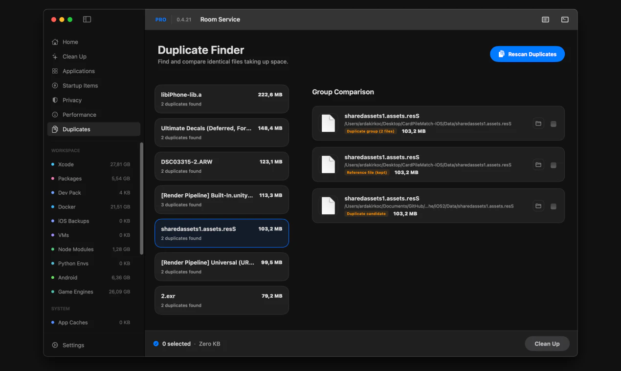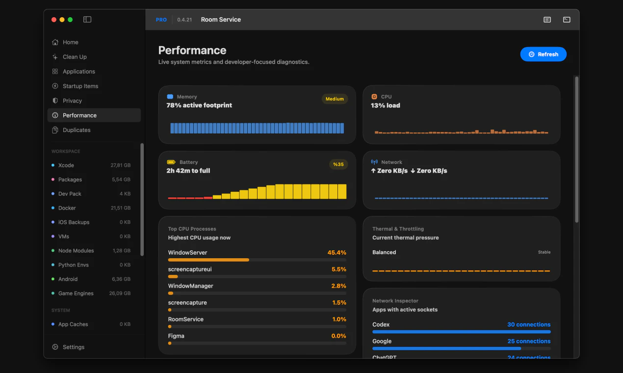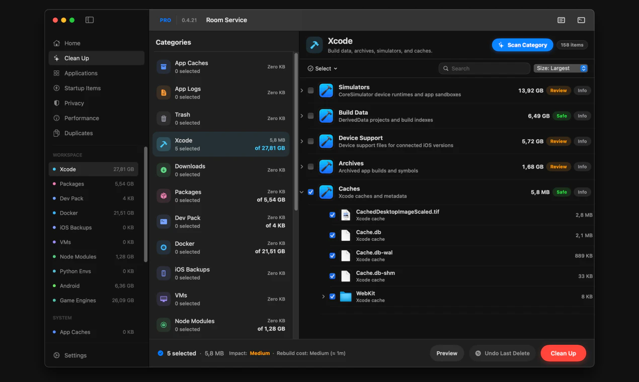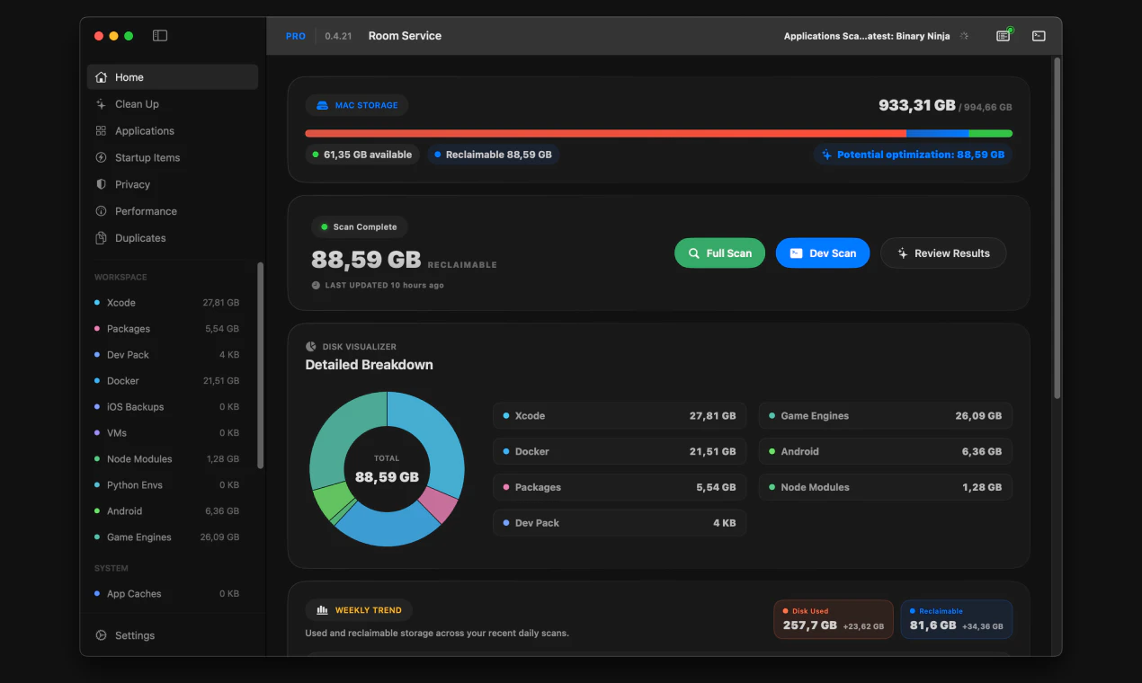 Room Service helps developers understand what is actually filling their Mac, then clean it with more confidence. From Xcode build data and package caches to Docker, generated folders, app leftovers, duplicates, and privacy traces, it turns scattered disk clutter into a workflow you can inspect, review, and act on without losing control.