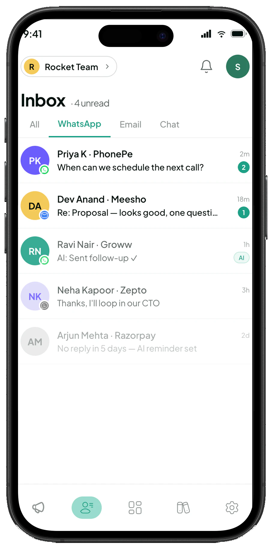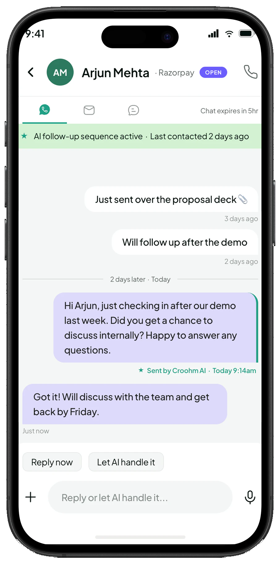 CRoohM is the mobile-first shared inbox small teams need—no more switching between WhatsApp, email, and Instagram tabs. Unlike bloated CRMs, we're conversation-first: unified view, team assignments, AI drafts/summaries, and relationship context in one spot. Standouts: WhatsApp-native for SMBs, AI coworker that spots stale leads, all on phone for founders drowning in chats. Built for under-50 teams.