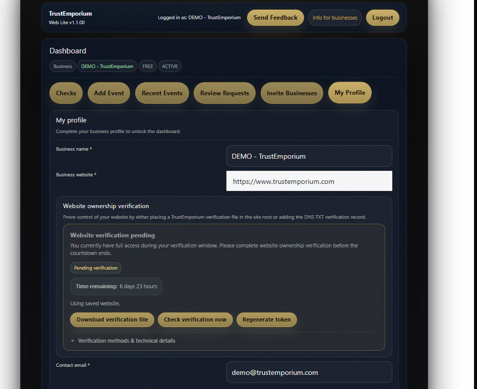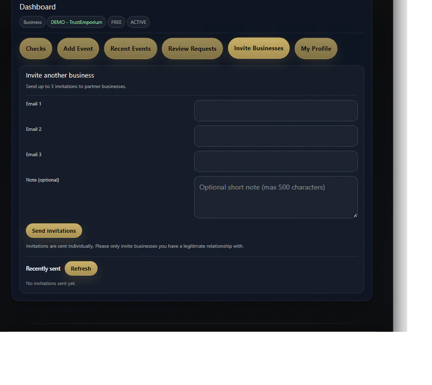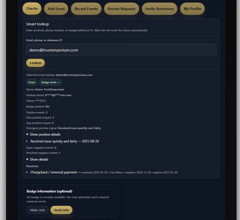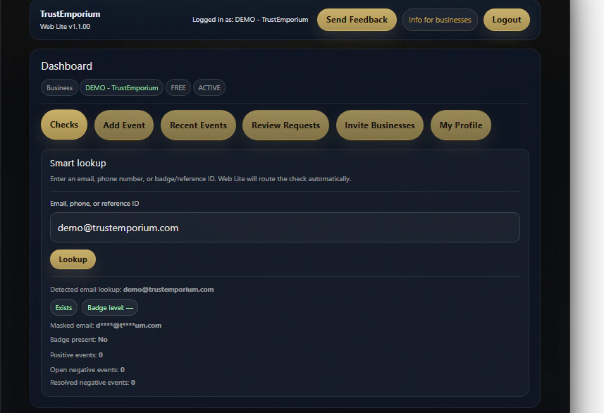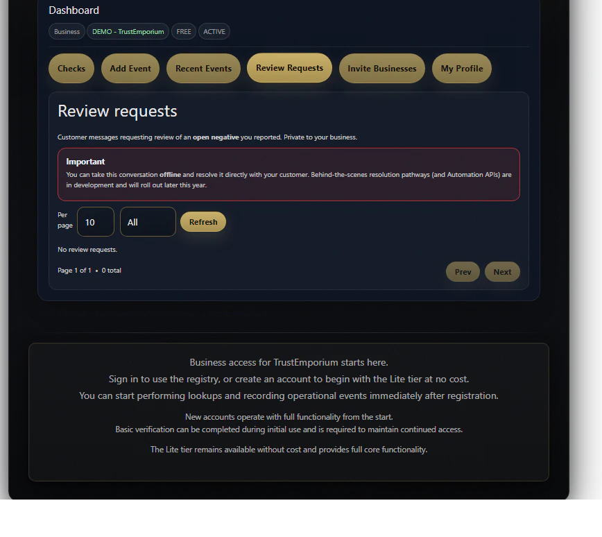 TrustEmporium is a neutral shared registry where businesses can observe structured operational interaction history across customers. It does not use public ratings or reviews. Instead, it preserves factual interaction records that provide context when relevant. The system remains passive and business-controlled, enabling independent decisions while maintaining continuity across interactions.