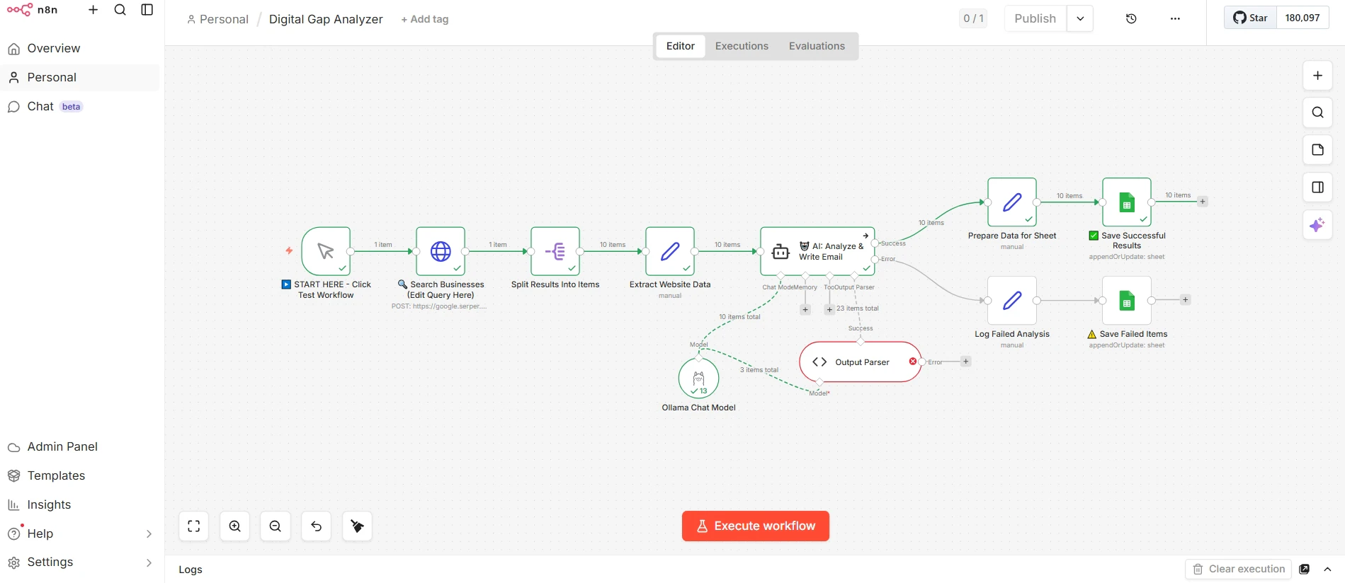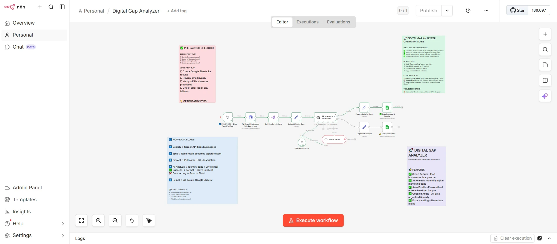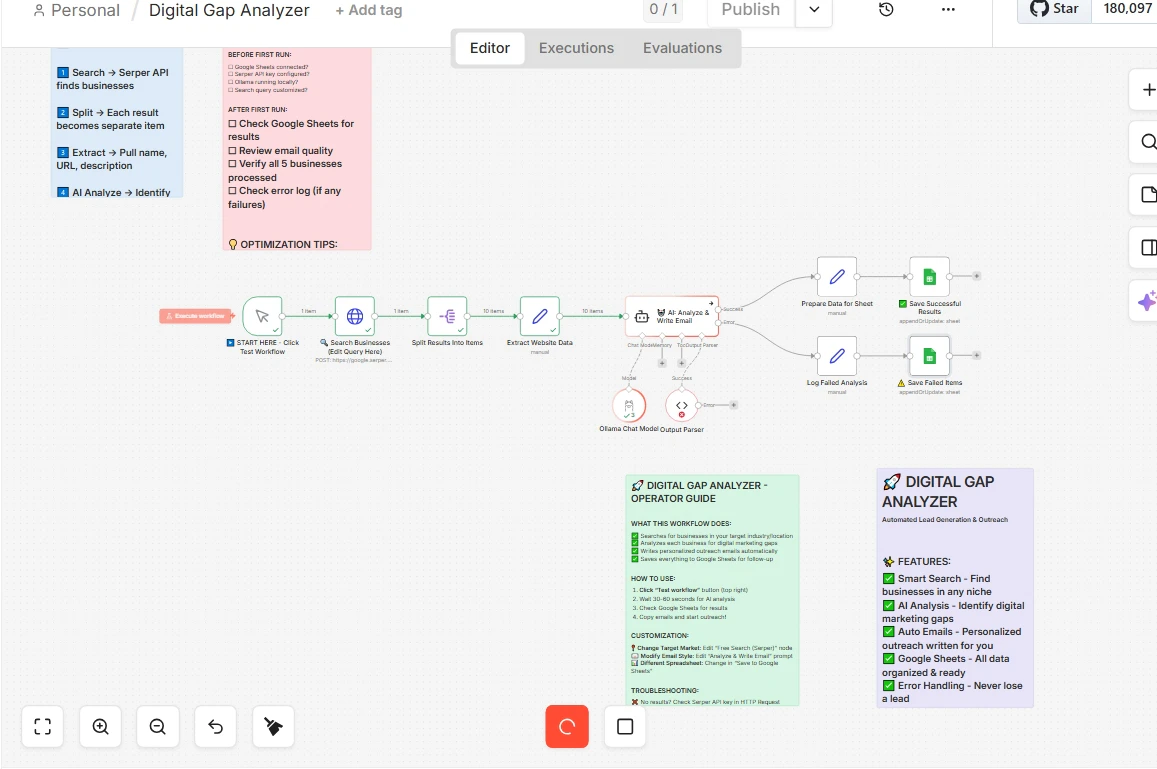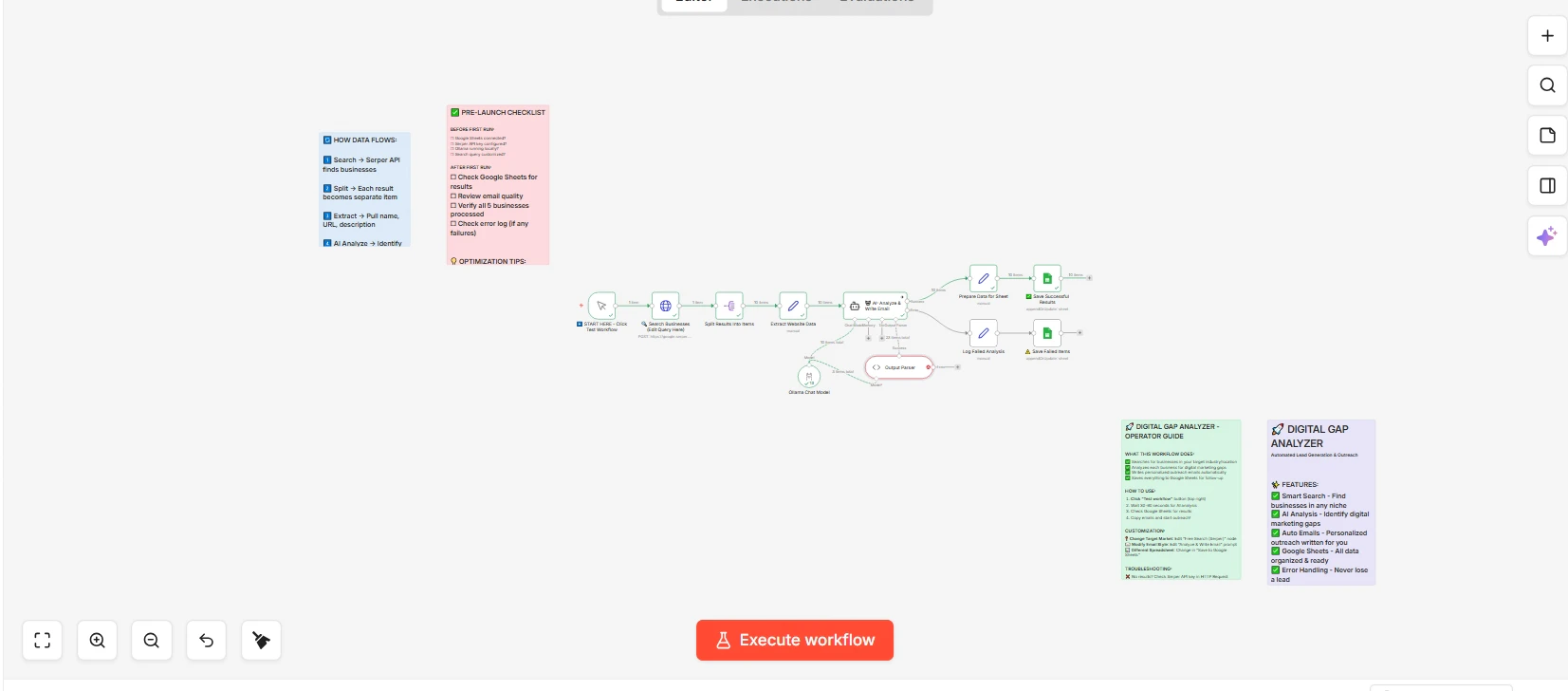 Bismillahir Rahmanir Rahim AI Digital Gap Analyzer (Local Privacy Edition) The 24/7 Automated Auditor that finds leads, identifies weaknesses, and writes emails—100% Offline with Zero Monthly Fees. Stop paying $100+/month for lead scrapers and AI subscriptions. Most lead generation tools send your sensitive data to the cloud. The AI Digital Gap Analyzer is built for the professional who demands Privacy and Performance. Using n8n and Local AI (Ollama), this workflow stays on yo