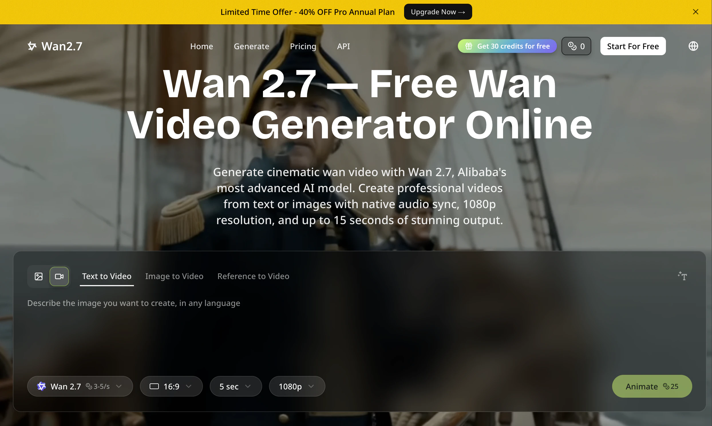 Try Wan 2.7 free online. Create stunning wan video from text and images. The best wan video generator with 1080p, audio sync, and 15s cinematic output.