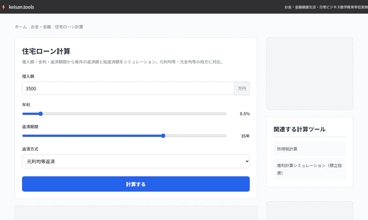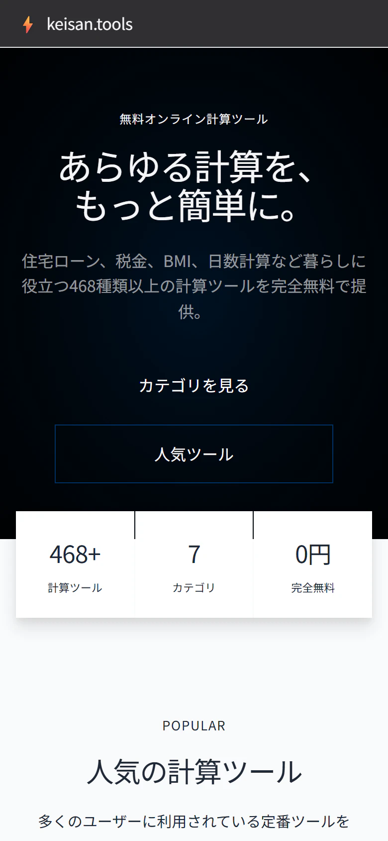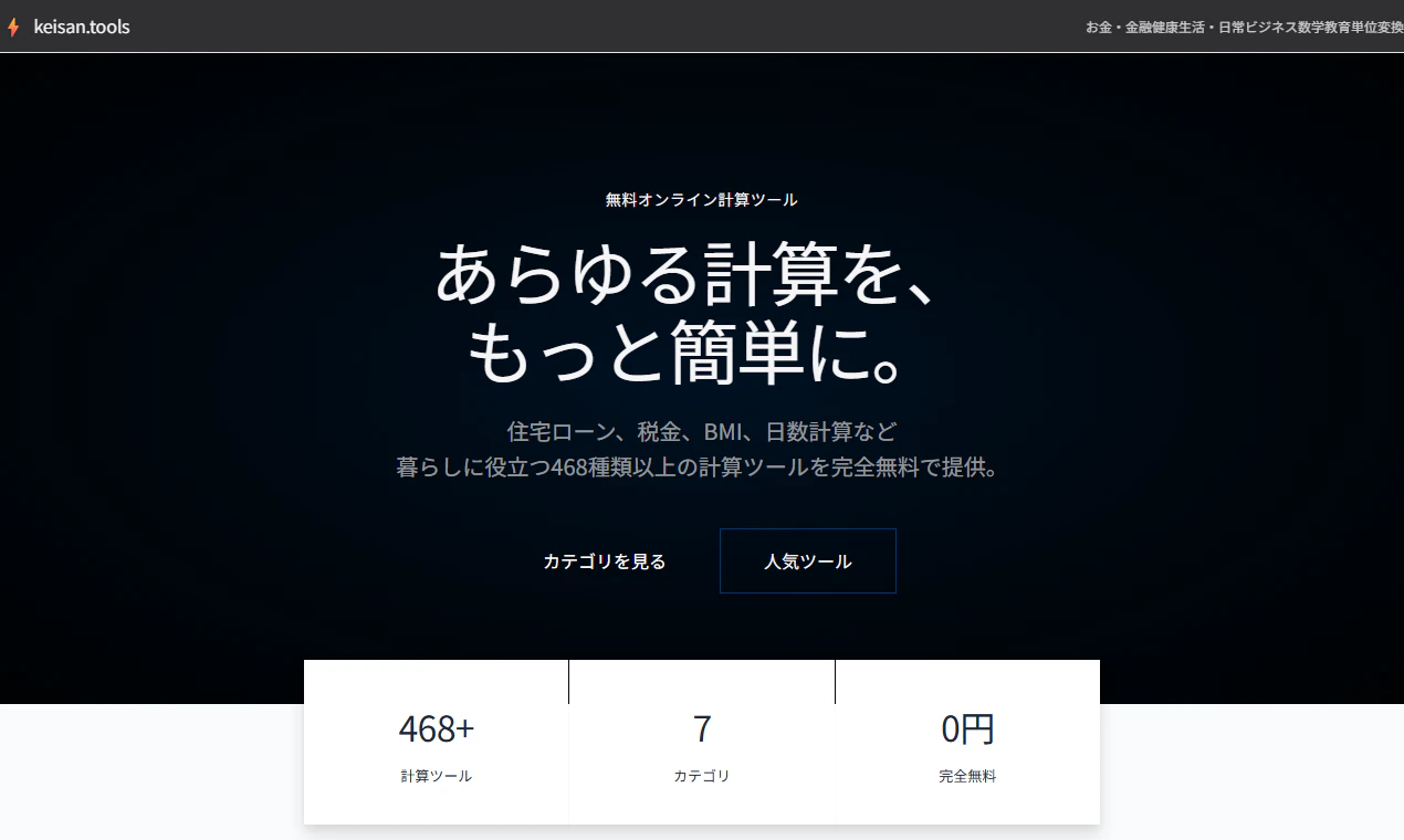 468 free online calculators covering tax, finance, health, unit conversion, math, date, everyday life, and programming. No ads, no sign-up, no popups. Every calculation runs client-side — your data never leaves your browser. Built with Next.js SSG for sub-second load times. Japanese and English bilingual support. New calculators added weekly based on user requests. From BMI and loan payments to hex converters and regex testers — if you need to calculate it, it's probably here.