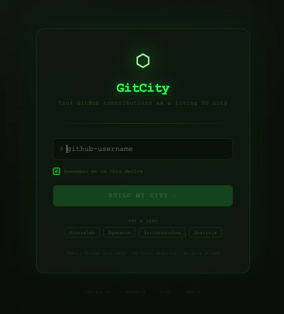 GitCity turns your GitHub contributions into an interactive isometric 3D city. Every commit grows a building. The more consistent you are, the taller your skyline. The part everyone talks about: switch to simulation mode and drive a car through the city you built with your code. → Driveable city simulation → 6 themes: Matrix, Noir, Aurora, Ocean, Gold, Ice → README embeddable SVG → No login needed — just enter any GitHub username → Free and open source